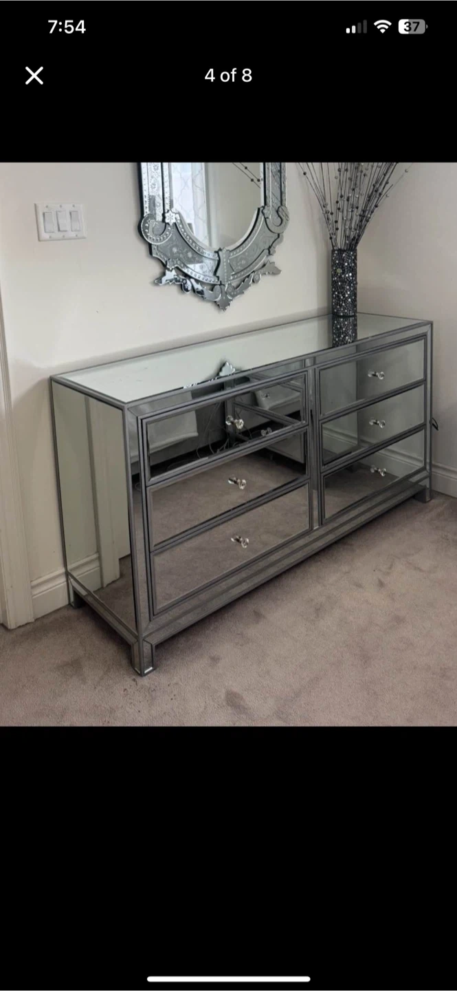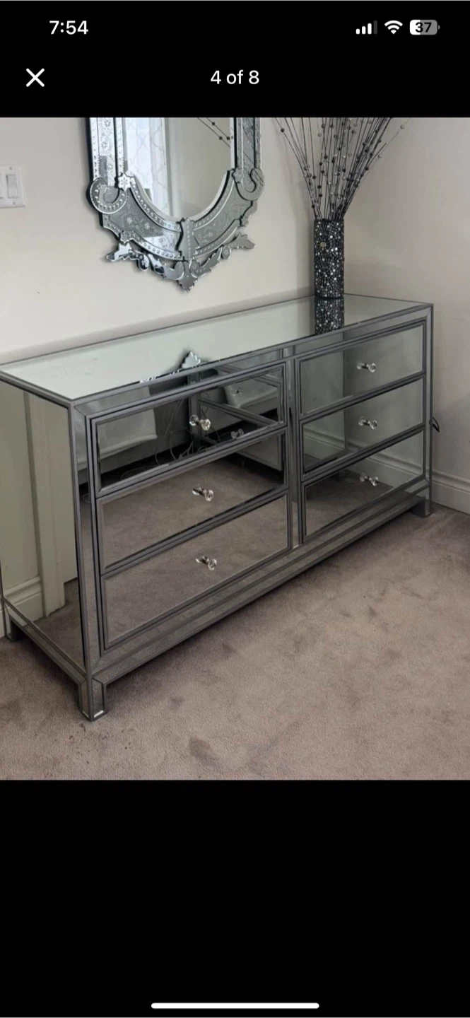 This mirrored dresser features a sleek design with crystal-like drawer knobs. It has a combination of wider and narrower drawers for varied storage needs. A stylish piece for any bedroom!