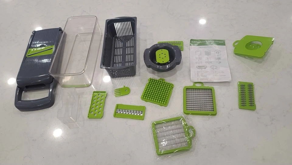 Selling a multi-functional vegetable chopper and slicer set in good condition. It comes with multiple interchangeable stainless steel blades for chopping, slicing, dicing, and shredding vegetables quickly and easily. Includes chopper, slicer, grater functions, a container, and a draining basket. Easy to use and clean, great for onions, potatoes, carrots, cucumbers, and more. Condition is good and lightly used, with some blades still unused. Selling because I'm moving out.