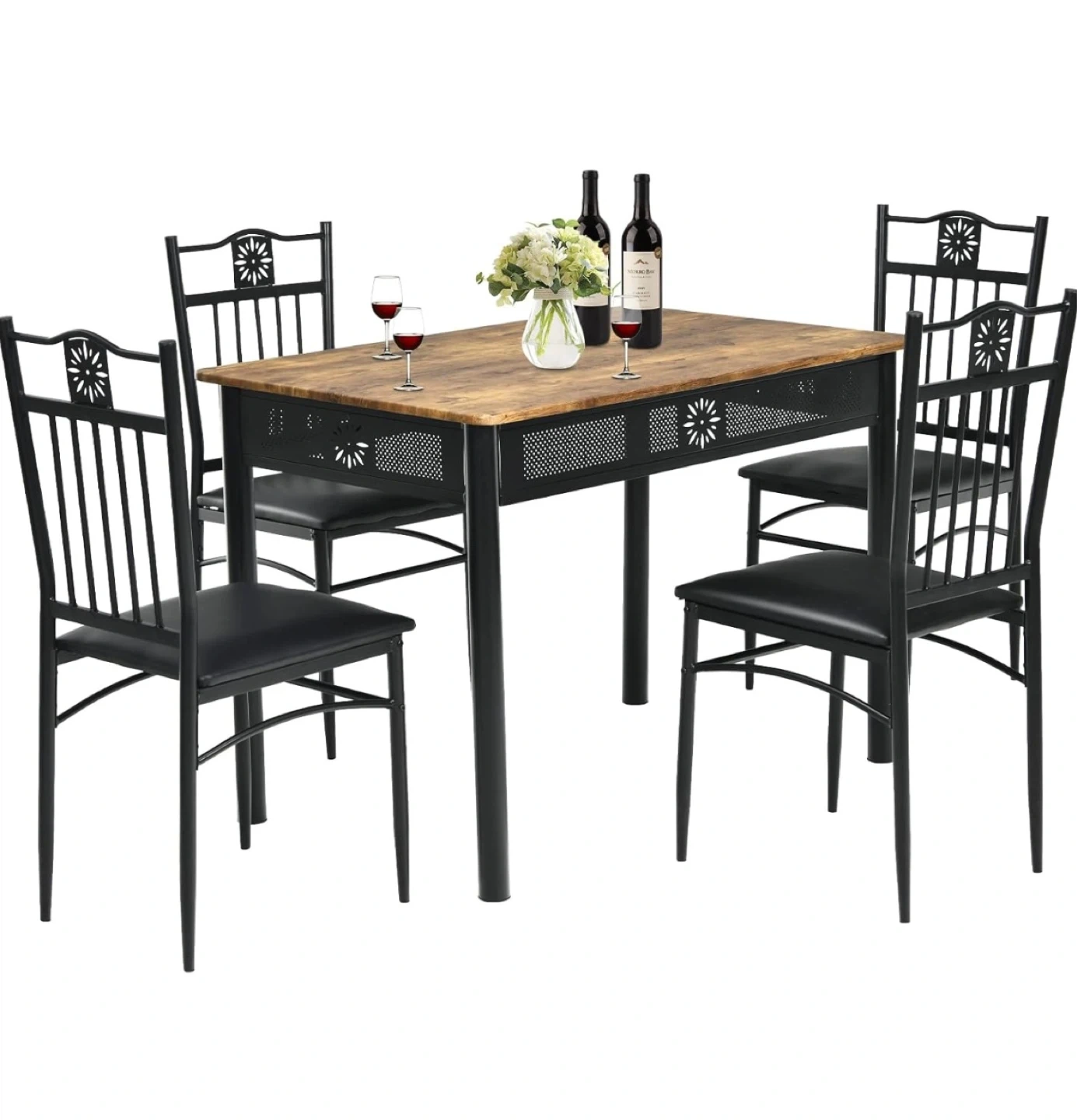 This dining set includes one rectangular table with a wood-look top and four metal chairs with black padded seats. The chairs feature a decorative backrest with a starburst design. The table has a black metal frame with decorative cutouts. It's perfect for small dining 42” Rectangular Table w/ 4 Upholstered chairs perfect for small dining area or used as a cute desk.