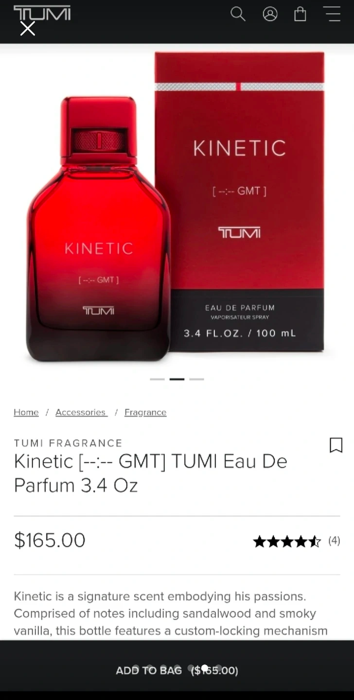 Selling a bottle of TUMI Kinetic Eau de Parfum. It's a 200 mL bottle and comes with the box. A great scent for everyday wear!