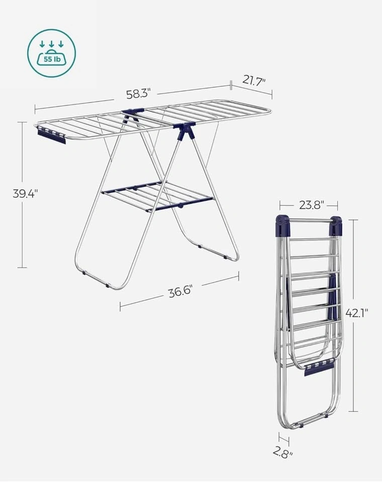 This is a great all-in-one solution for drying your clothes. It has 24 hanging rods and 27 clips for lightweight items. The top wings are adjustable to three different heights, perfect for clothes of all lengths, from shirts to sheets. When not in use, it folds down flat for easy storage and is lightweight for moving around. Assembly is simple with no screws needed. Made with thick steel tubes and durable plastic connectors, it's rust-resistant, heavy-duty, and can hold up to 55 lb. Pick up in Courtice. Please check my other listings!