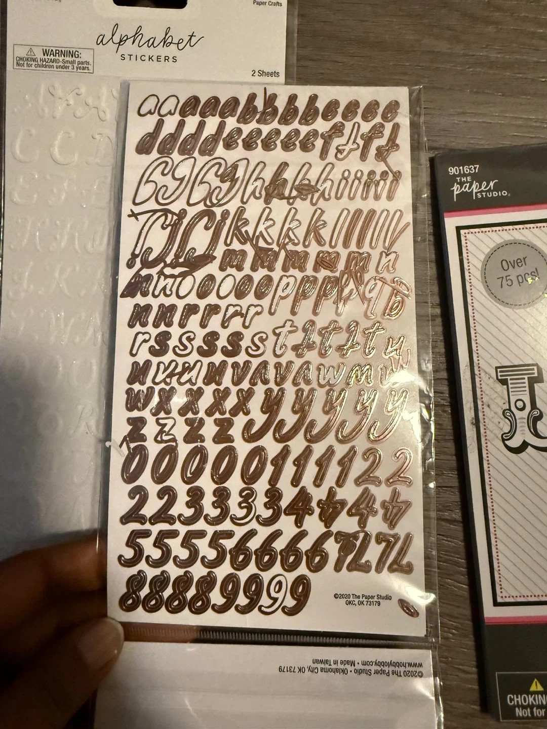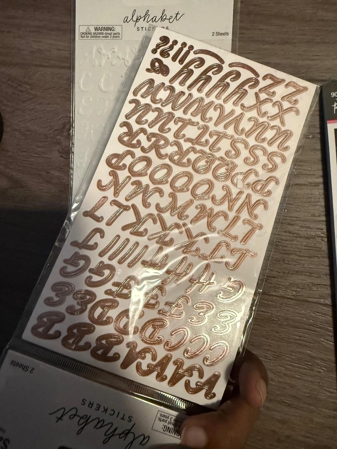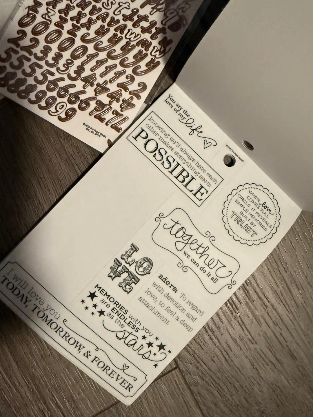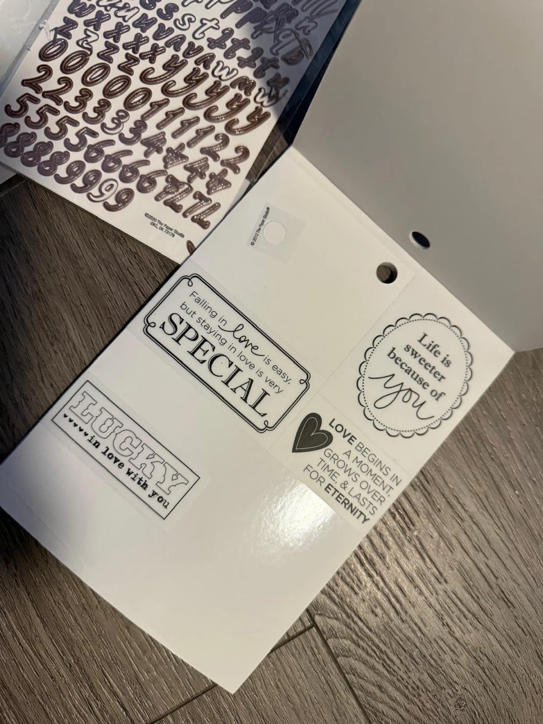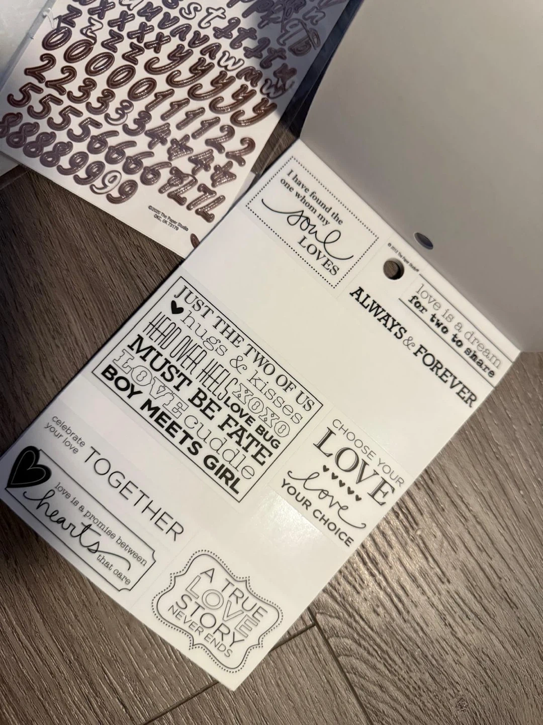 This set includes alphabet stickers in white and rose gold, plus a 'Love' themed sticker pack with various phrases and designs. Great for scrapbooking and card making!