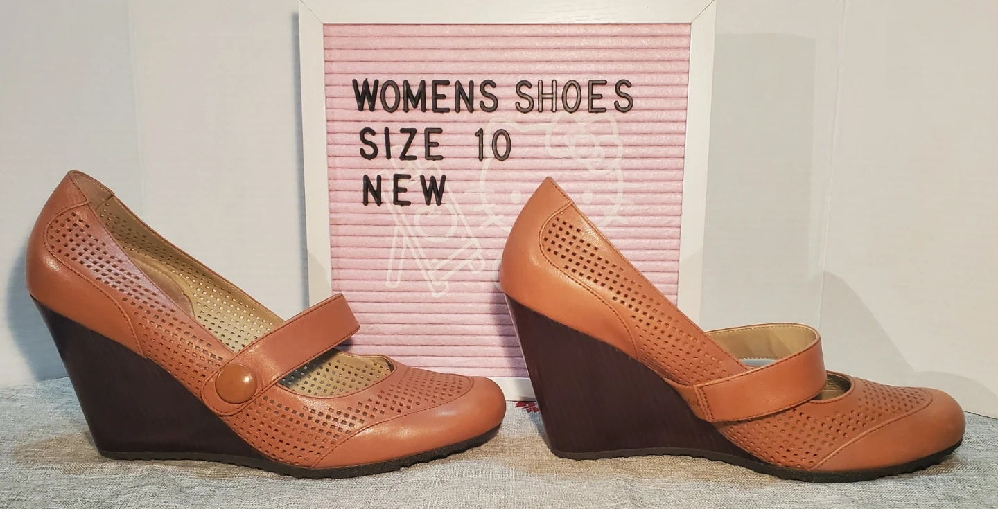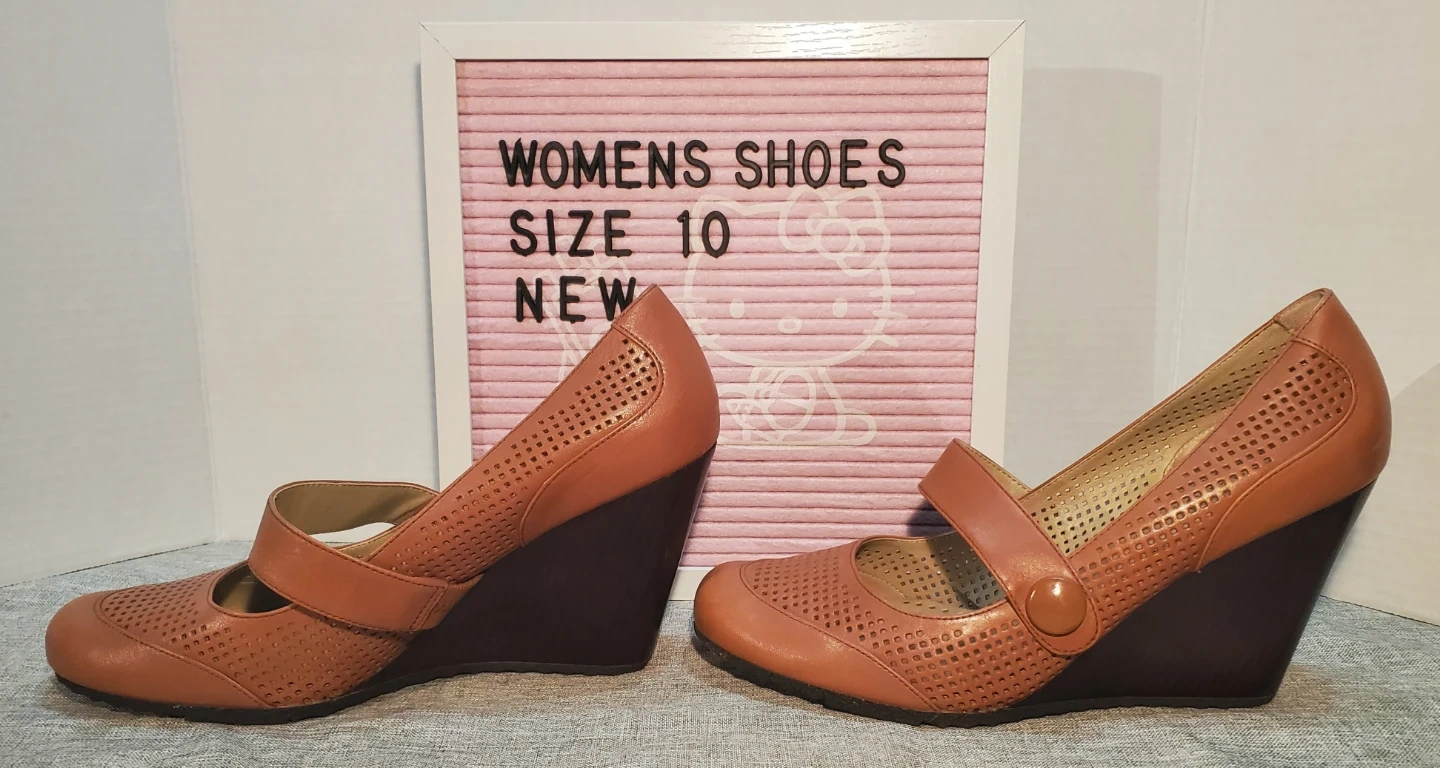 These Kenneth Cole Reaction leather wedge shoes feature a stylish perforated design. They have a comfortable adjustable strap with a button closure. Size 10.