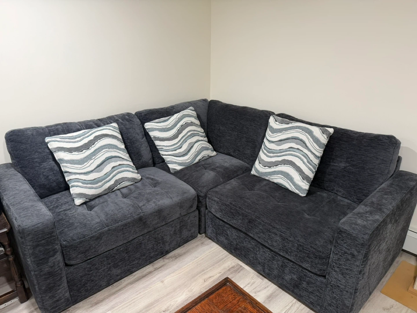 Dark gray upholstered sectional sofa. Includes 3 decorative throw pillows with a wave pattern. Good for small spaces apartment. Bought 8 mos ago.