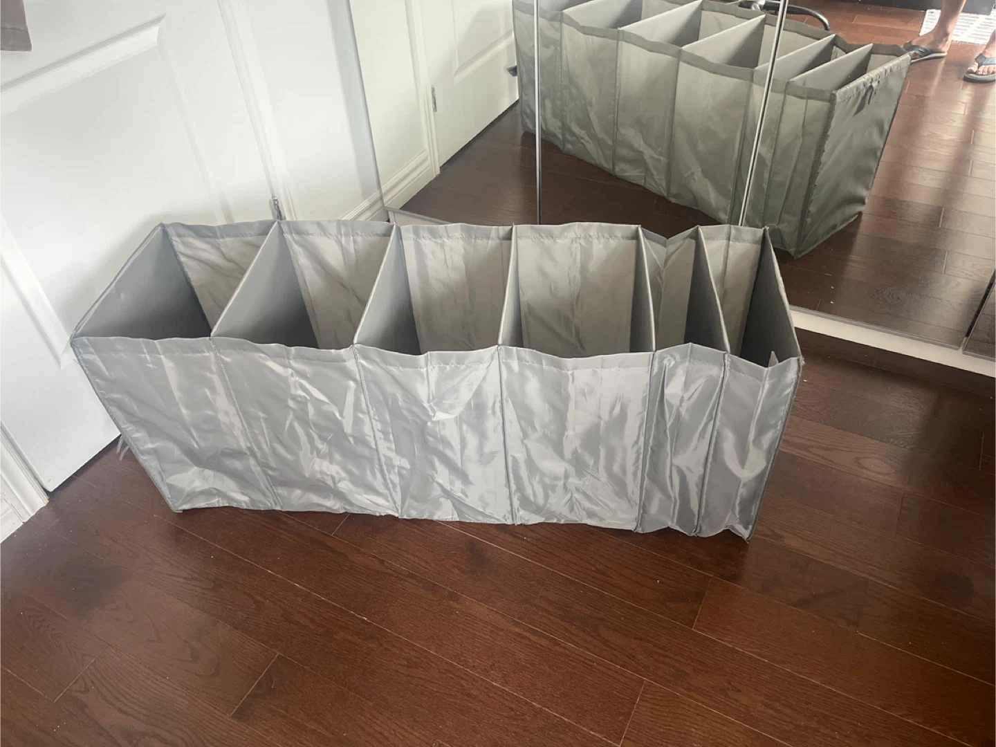 This closet organizer has six compartments for storing clothes or accessories. It's made of fabric . Great for keeping your closet tidy!