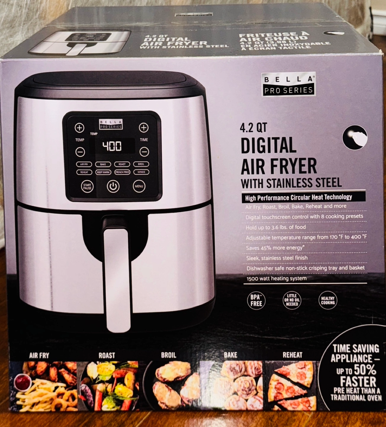 Bella Pro Series 4.2 QT digital air fryer. Features stainless steel exterior, touchscreen controls, and multiple cooking functions. Includes additional parchment paper liners for free.