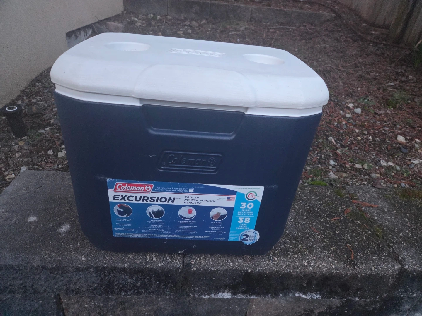 This is a Coleman Excursion cooler in navy blue and white. It has a 30-quart capacity, holding up to 38 cans. The lid is designed to be a seat and it features built-in cup holders. It keeps ice for up to 2 days.