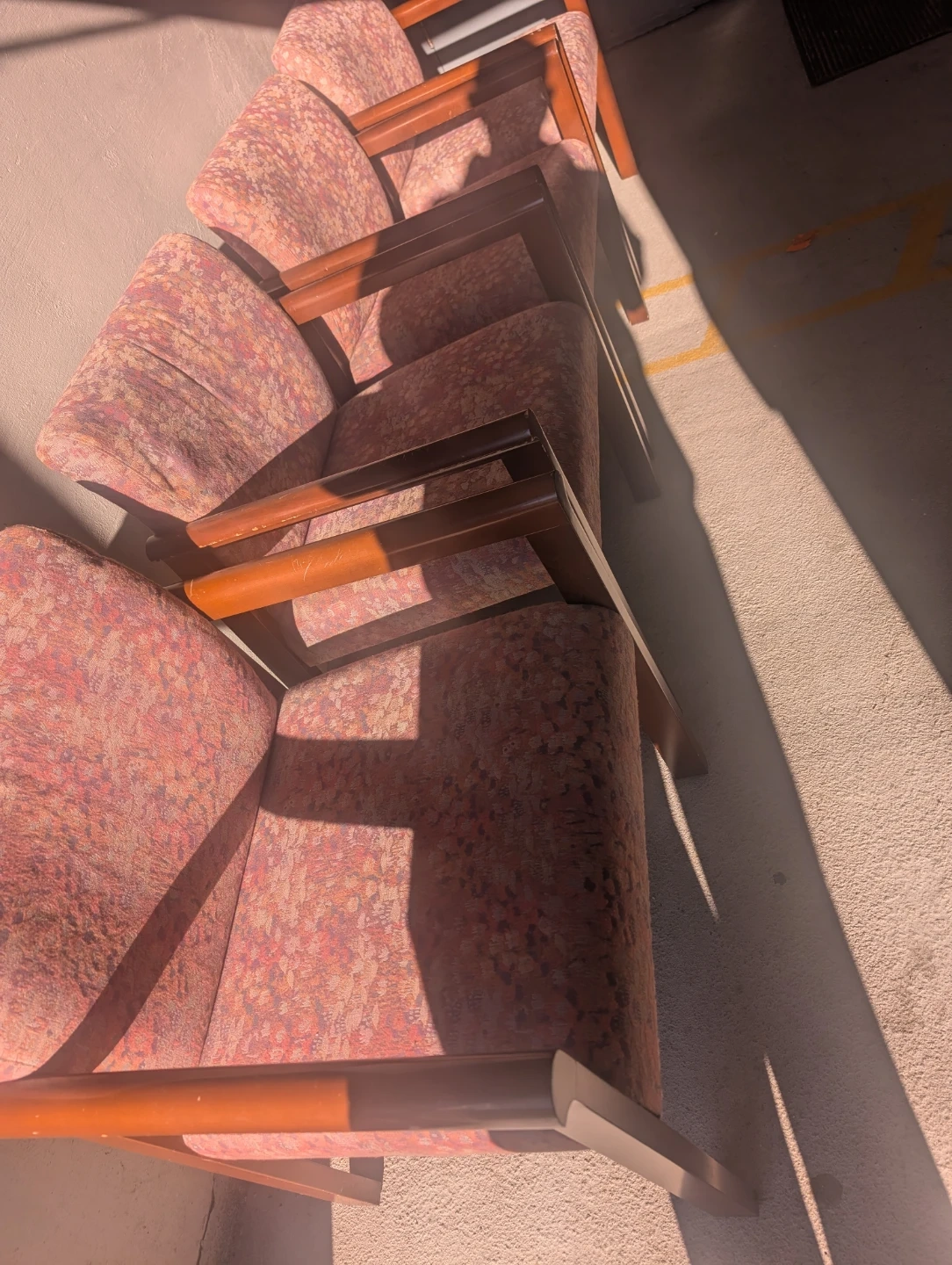 This armchair features a colourful floral pattern on the seat and backrest. It has a sturdy wooden frame and armrests. Upholstered in durable fabric.