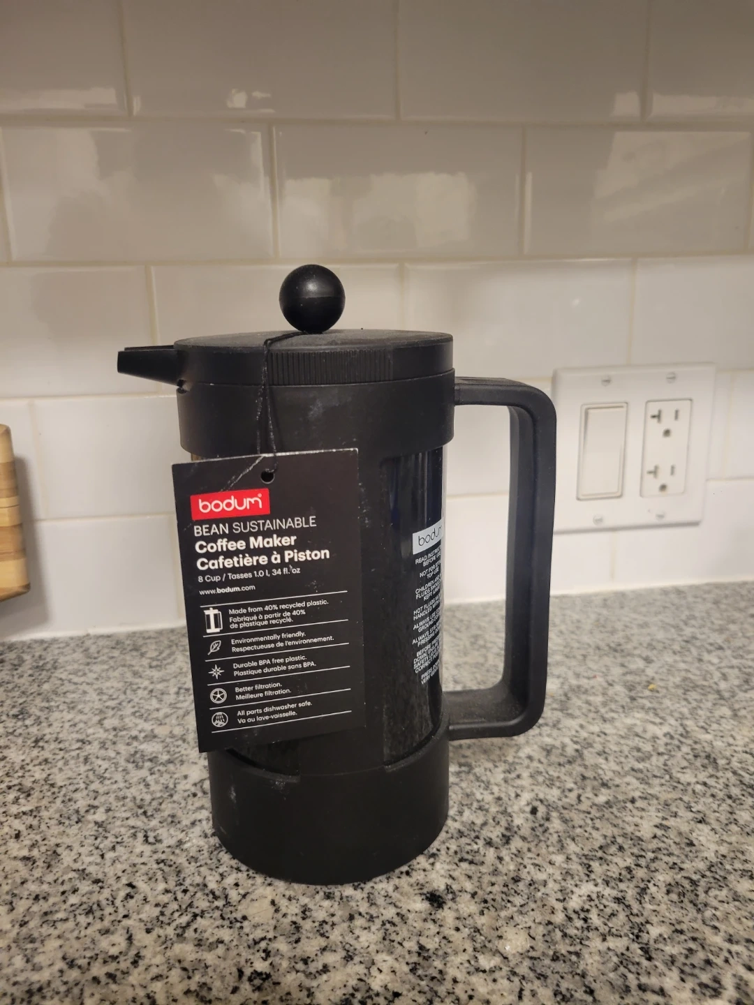 Bodum Bean Sustainable Coffee Maker. 8 Cup/Tasses 1.0 L, 34 fl. oz. Made from 100% recycled plastic, with up to 40% post-consumer waste. Environmentally friendly, BPA-free. Better filtration, durable BPA-free plastic, dishwasher safe.