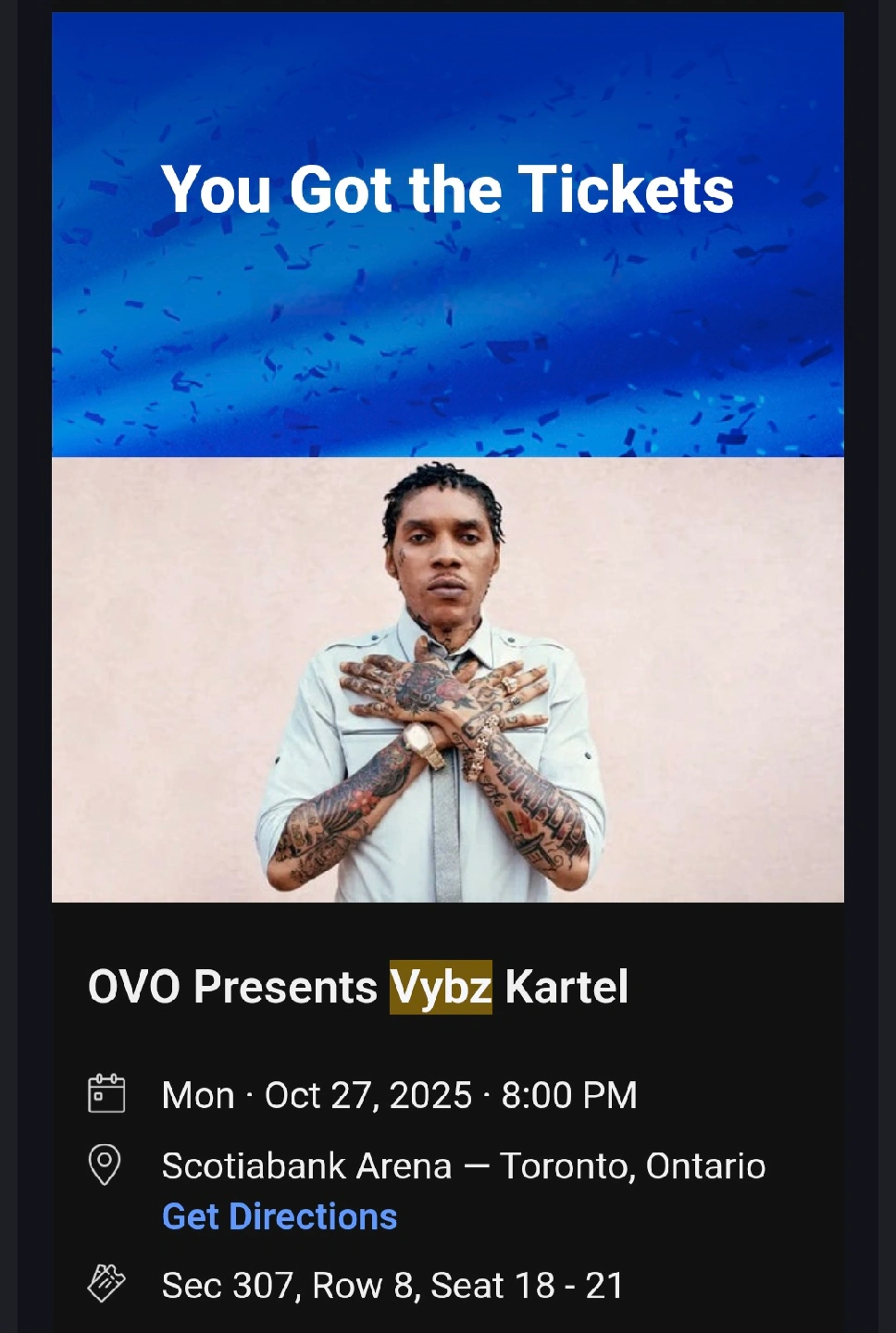 Selling four tickets to see Vybz Kartel at the Scotiabank Arena in Toronto on Monday October 27, 2025 at 8:00 PM Section 307, Row 8, Seats 18-21. $350 per ticket or $1400 for the set of 4.