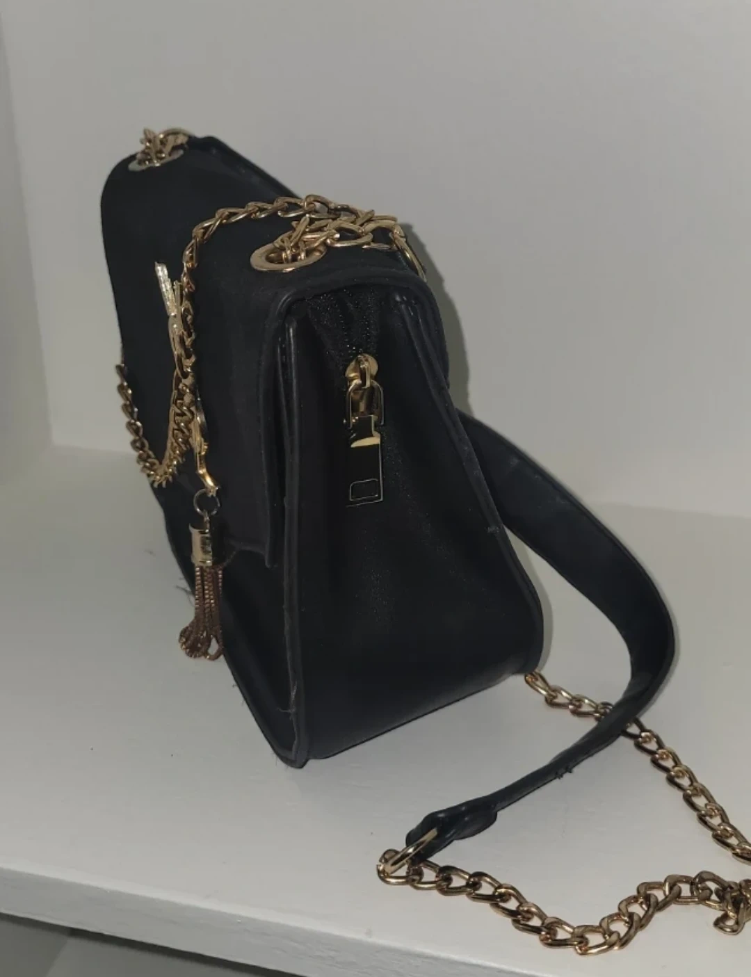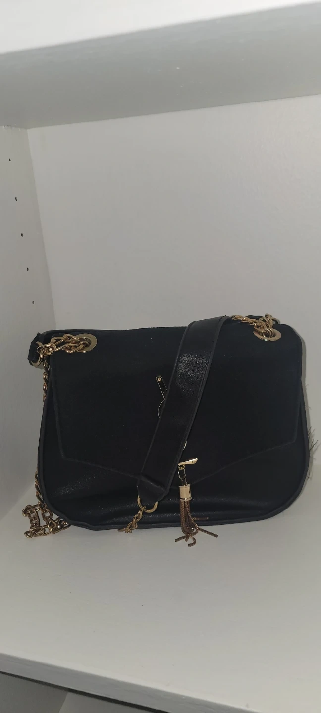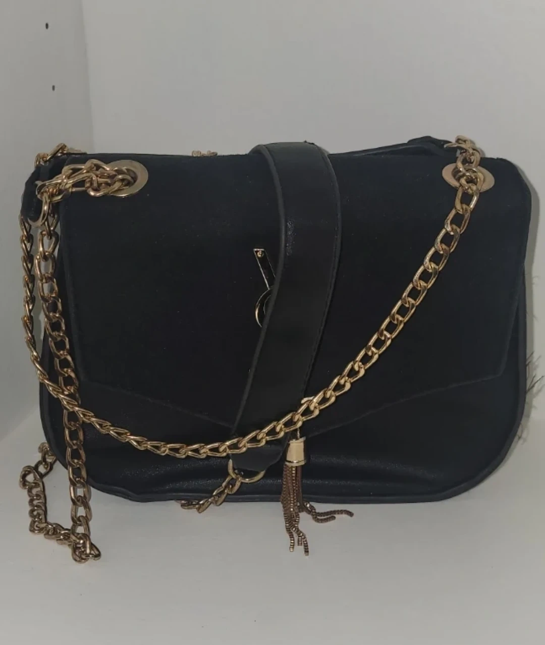 This black shoulder bag features a gold chain strap and tassel accent. It's made from a combination of leather and suede-like material. The bag has a flap closure with a magnetic snap.