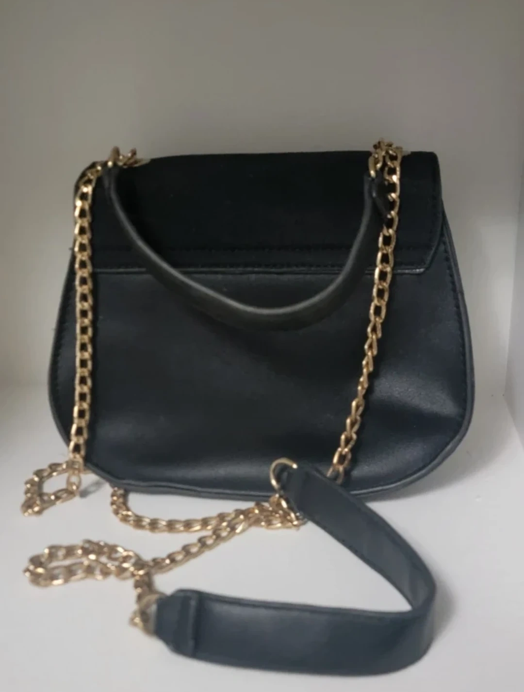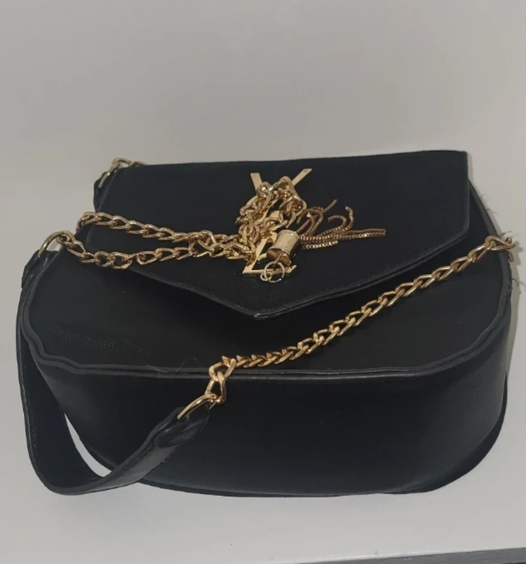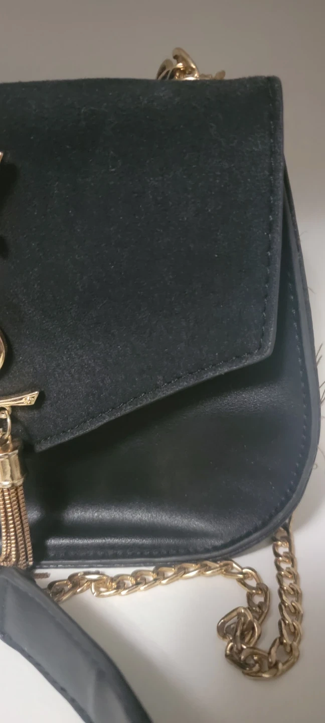 This black shoulder bag features a gold chain strap and tassel accent. It's made from a combination of leather and suede-like material. The bag has a flap closure with a magnetic snap.