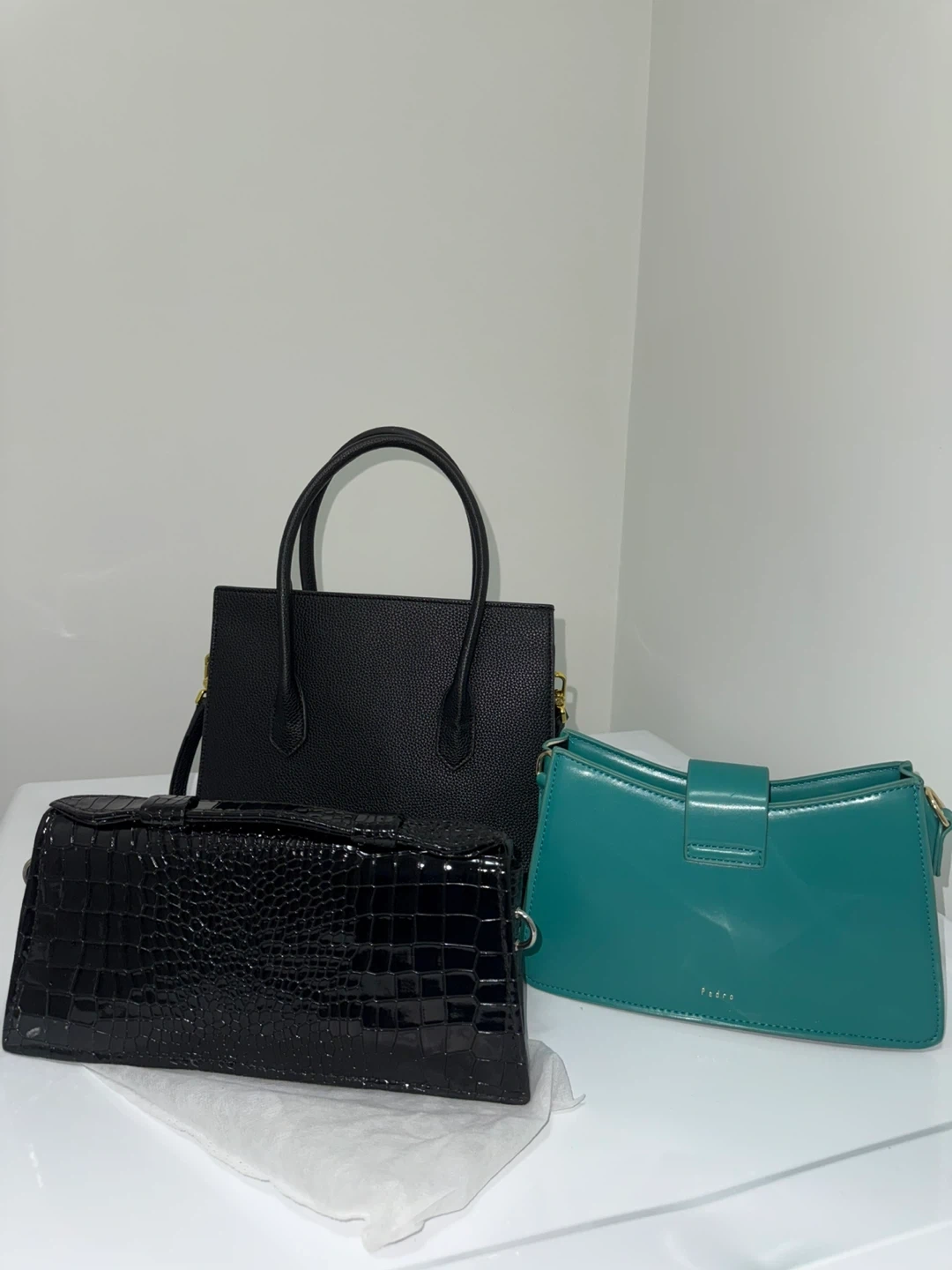 A set of three women's handbags. Includes a black pebbled leather top-handle bag with gold 'WV' emblem, a black patent croc-embossed clutch, and a teal shoulder bag with gold buckle detail. Brand 'Pedro' visible on teal bag.