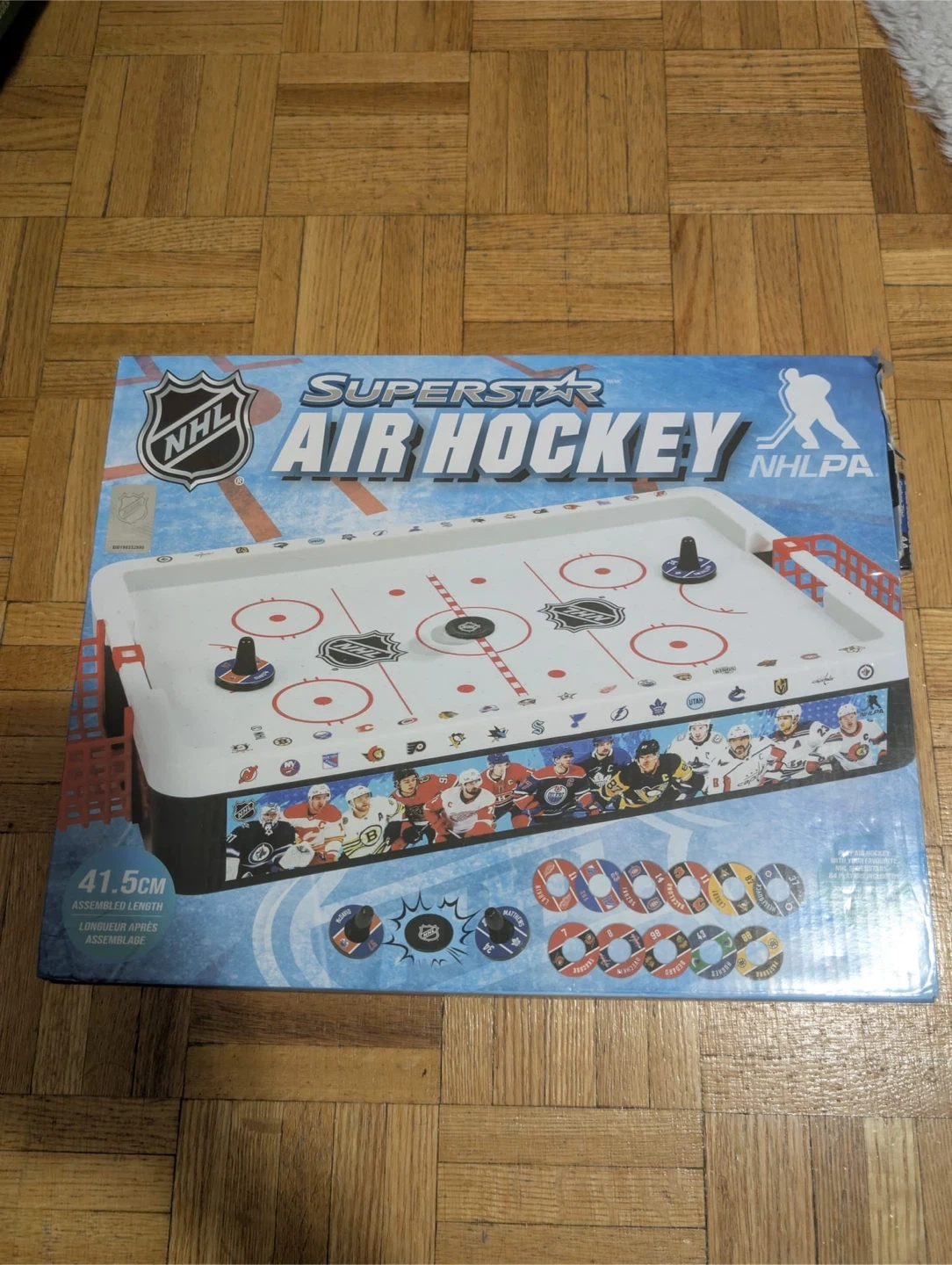 Bring the excitement of NHL Superstar Air Hockey home! This tabletop game comes with all the fun of air hockey and the thrill of the NHL. It features a 41.5cm assembled length. Includes arena, 2 pushers, and 2 pucks. Batteries not included.