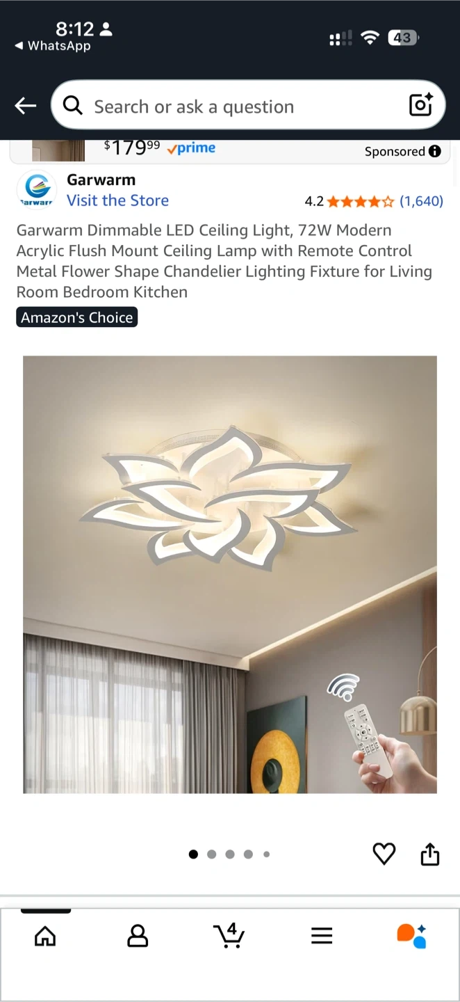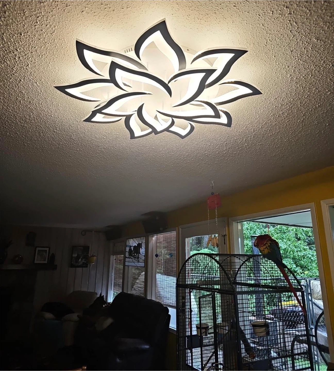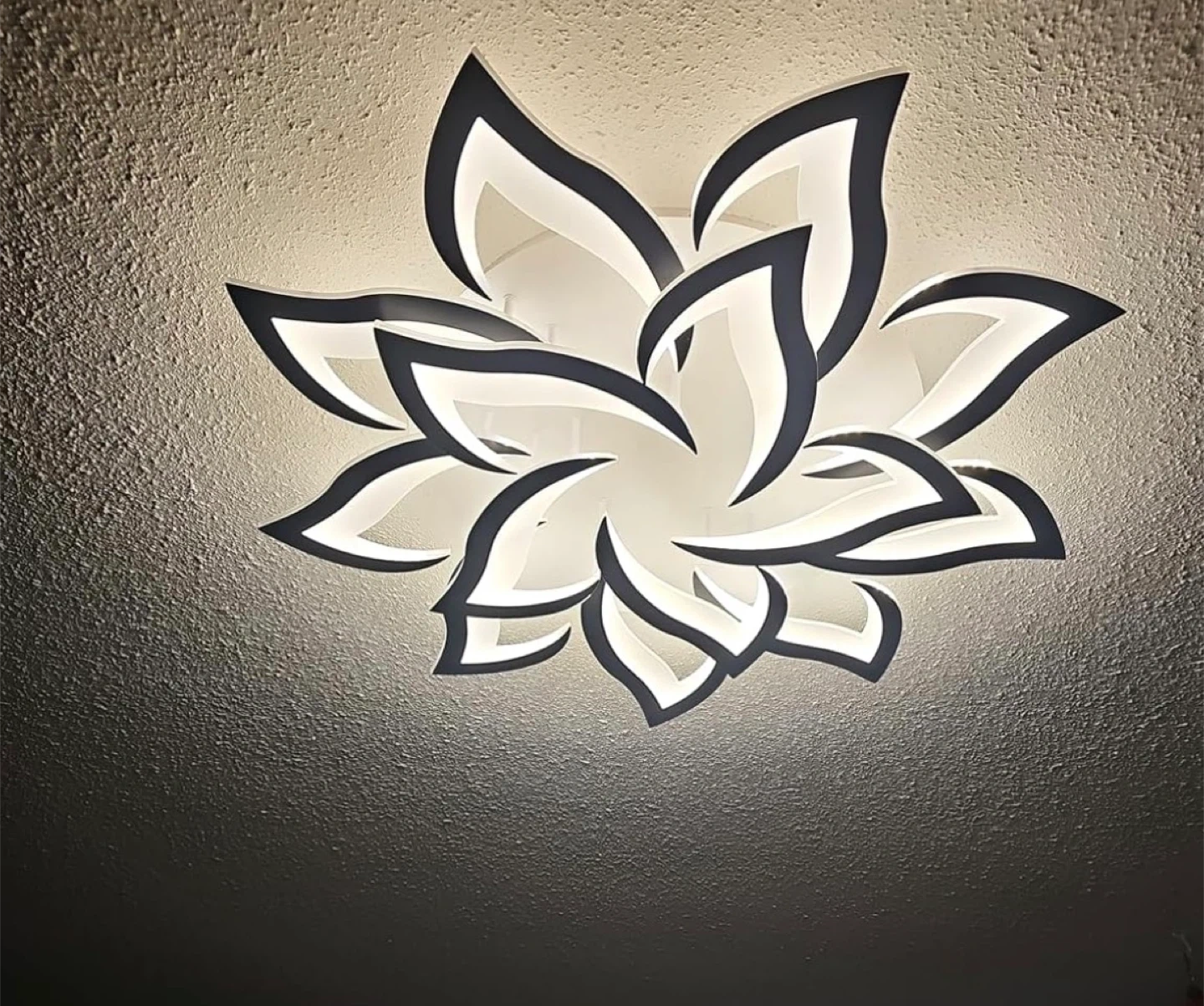 Selling a Garwarm dimmable LED ceiling light. It's a modern 72W light with a unique flower shape. The light fixture form is close to the ceiling. Made with high-quality metal and acrylic materials. Perfect for a bedroom, dining room, home office, kitchen, or living room. Size is Φ33.5" x H4.3".