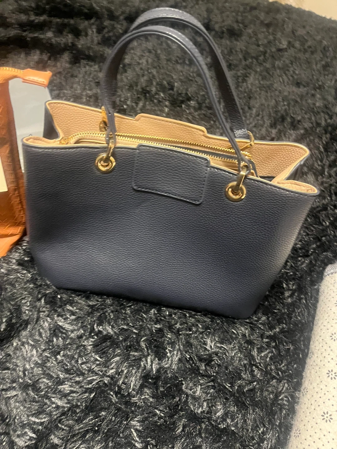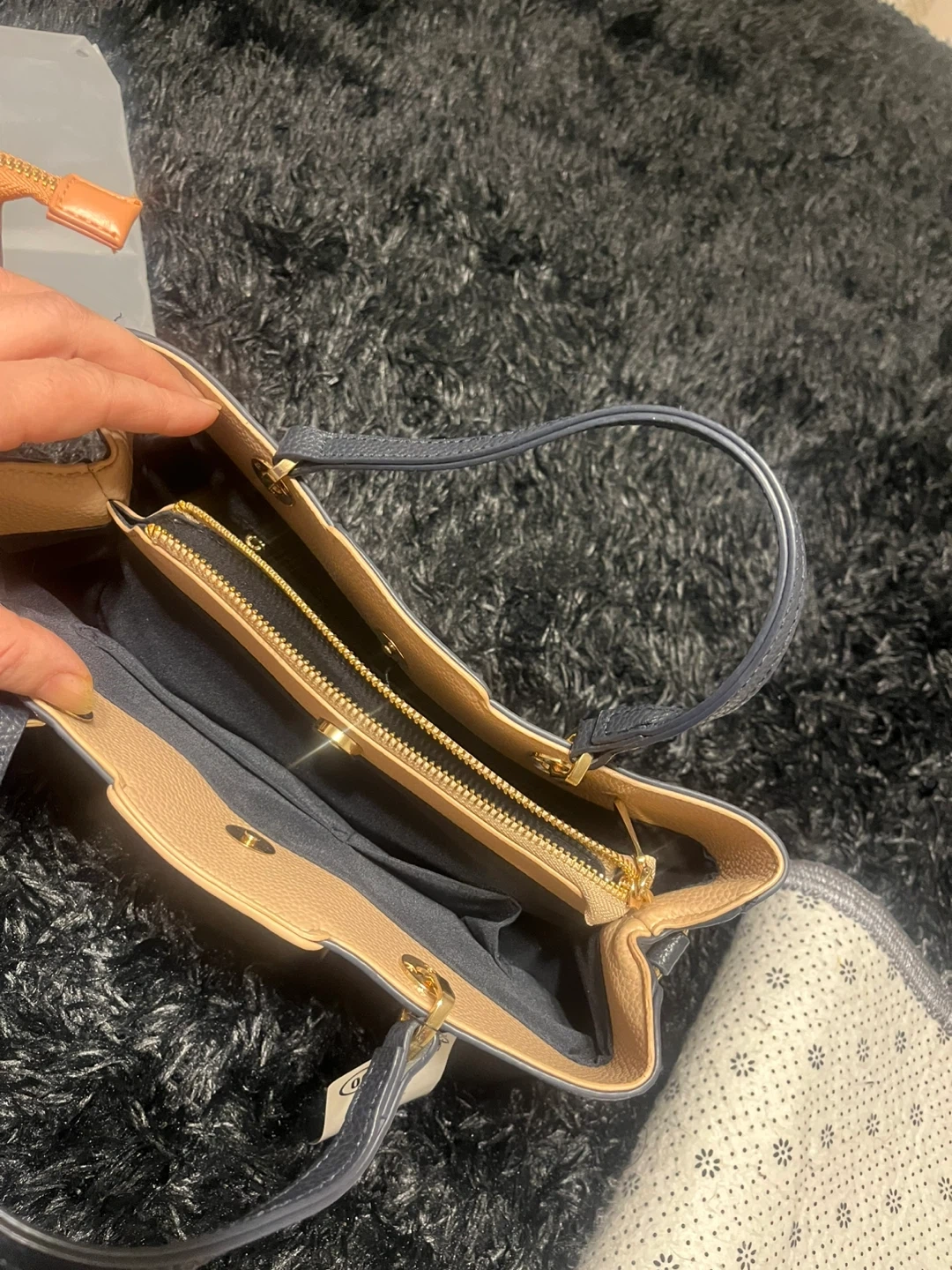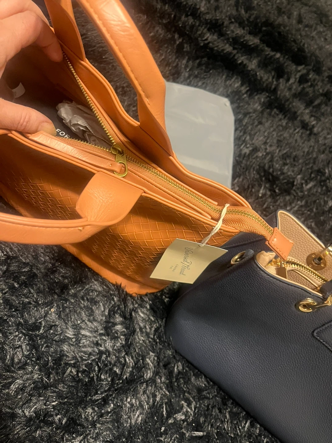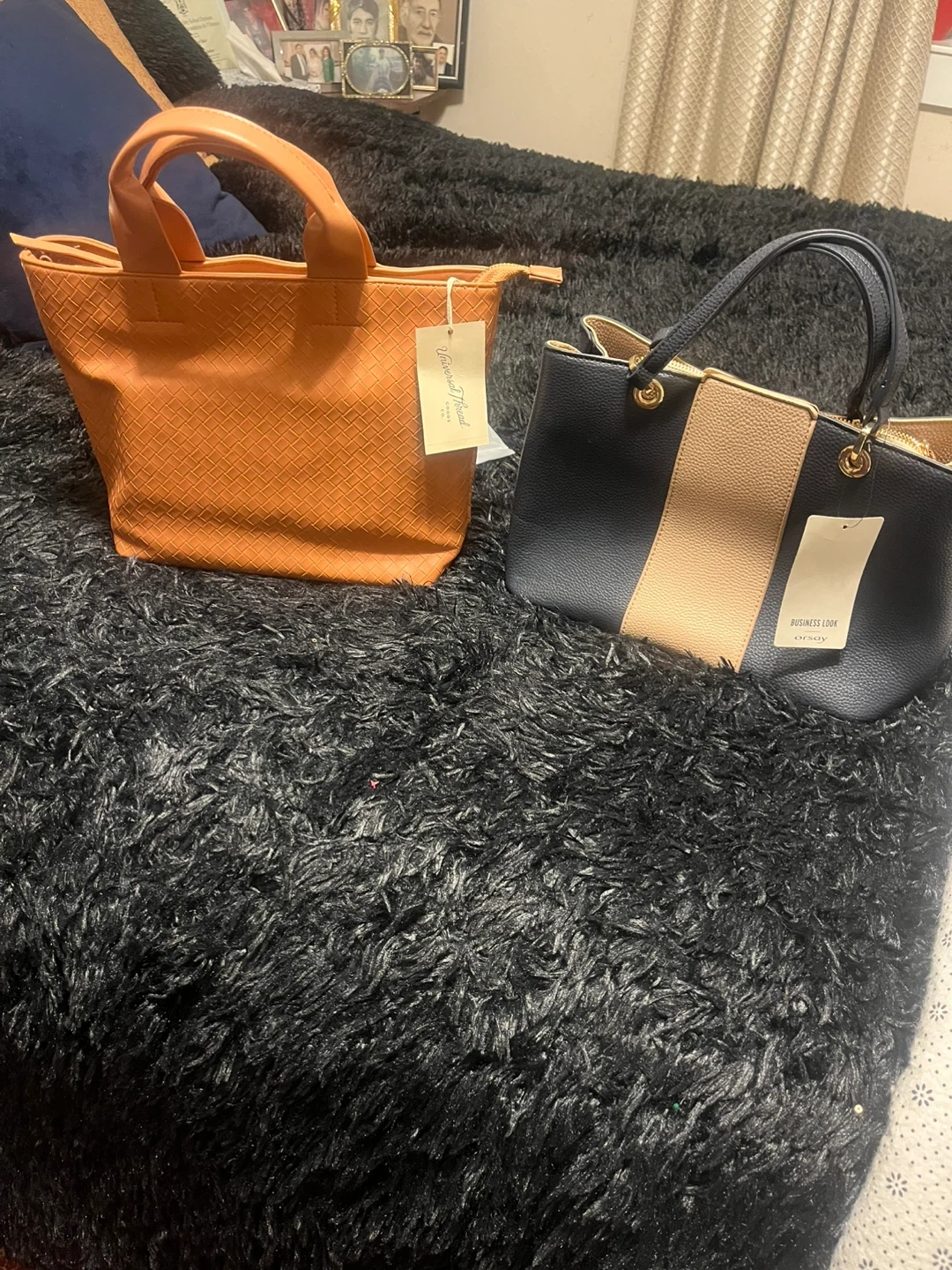Two stylish handbags, one in burnt orange with a woven texture and the other in navy with a neutral stripe accent. Both feature top handles and zip closures. Great for everyday use or special occasions!