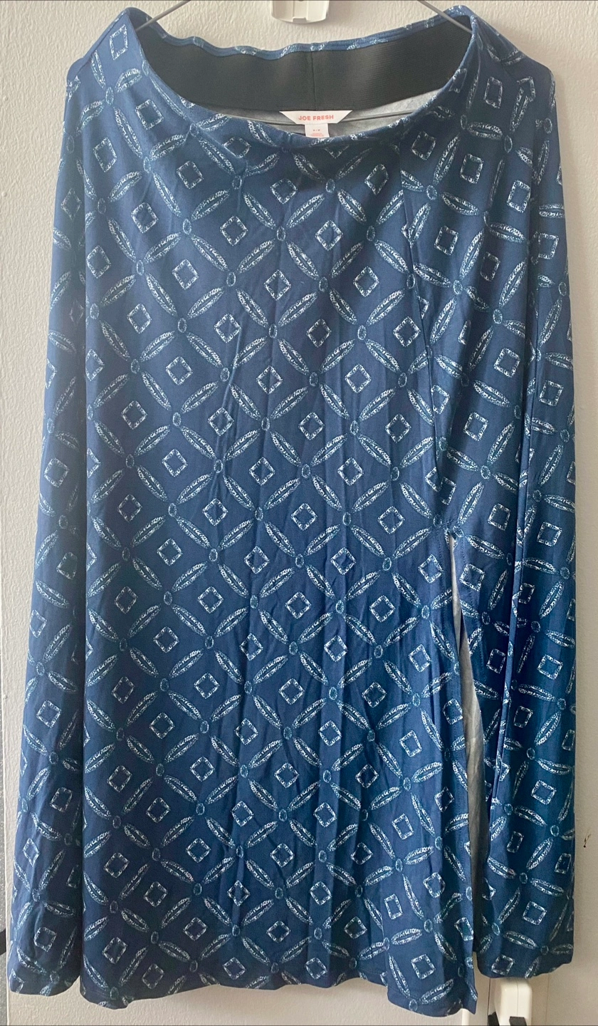 A lovely blue patterned tunic from Joe Fresh! It's a size small and in great condition. Perfect for a casual day out or dressed up for an evening occasion
