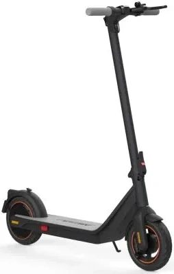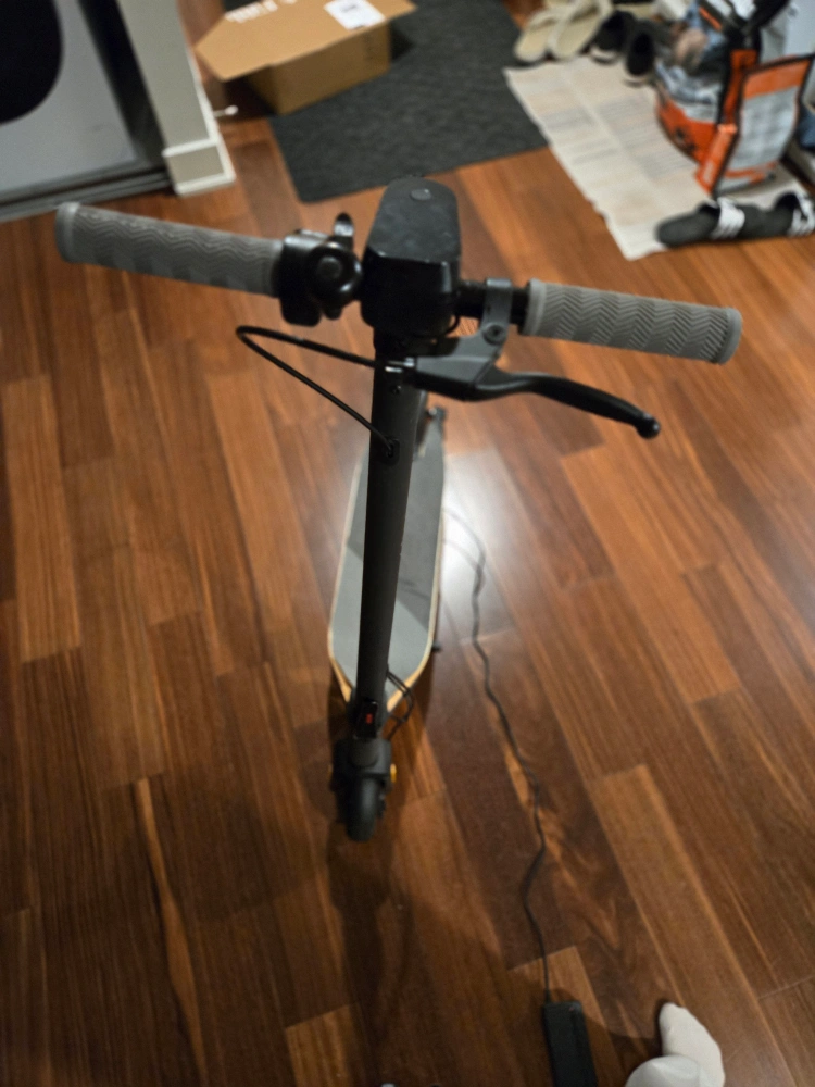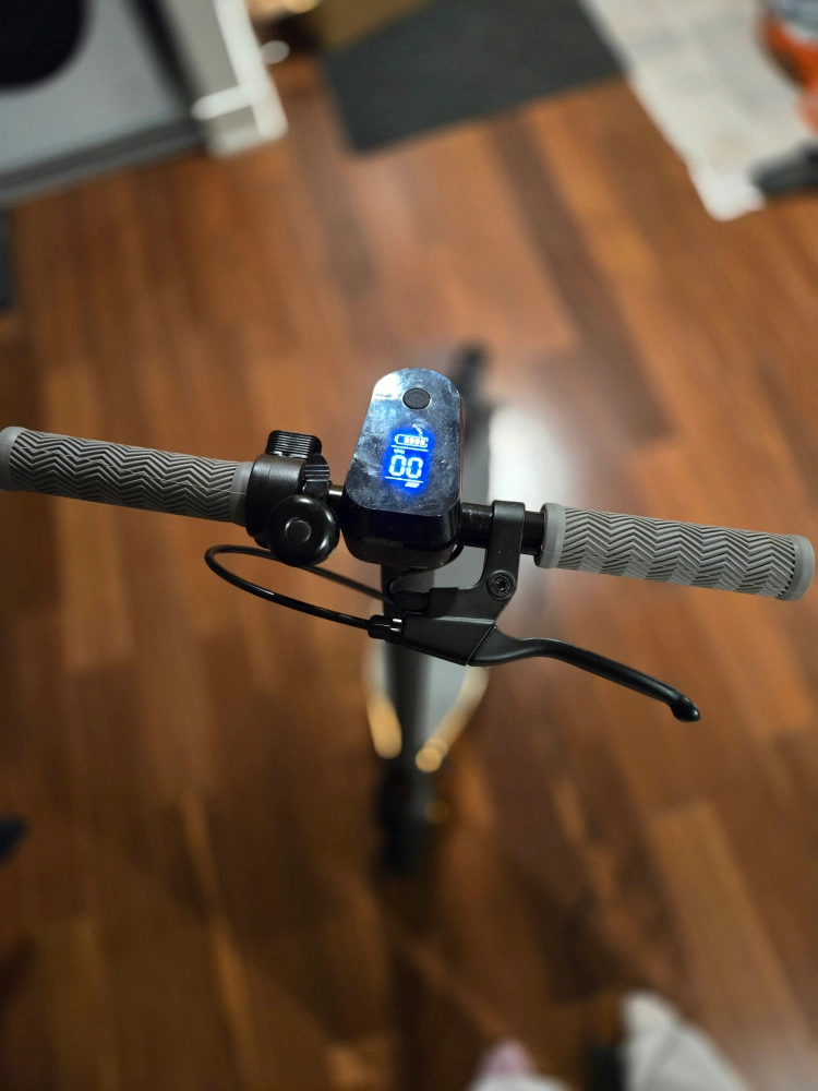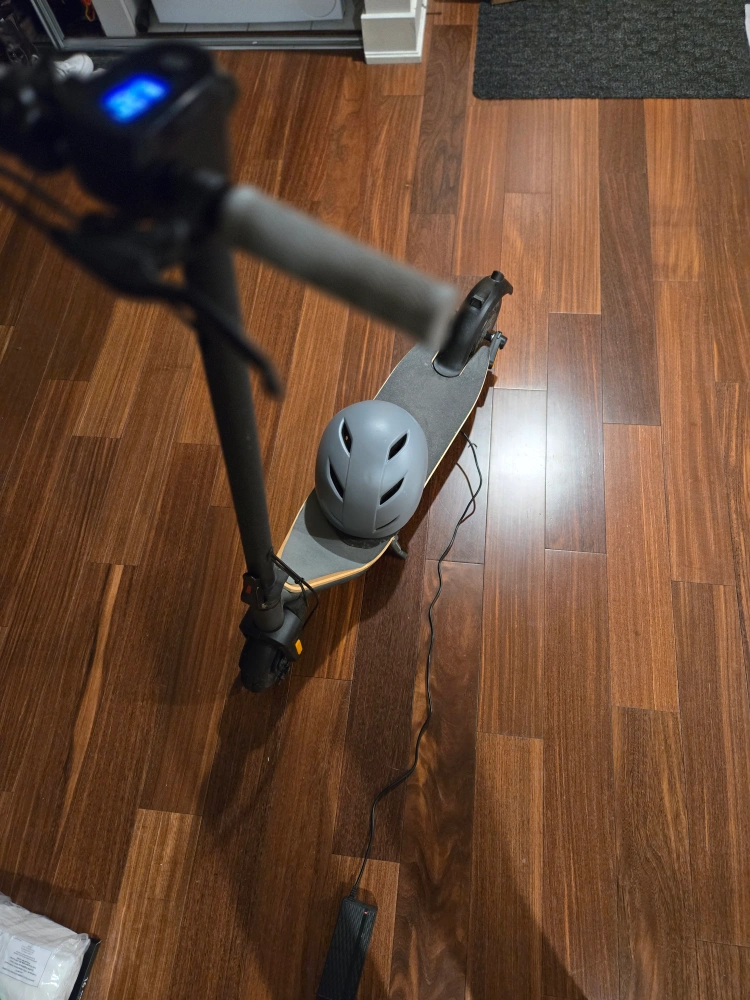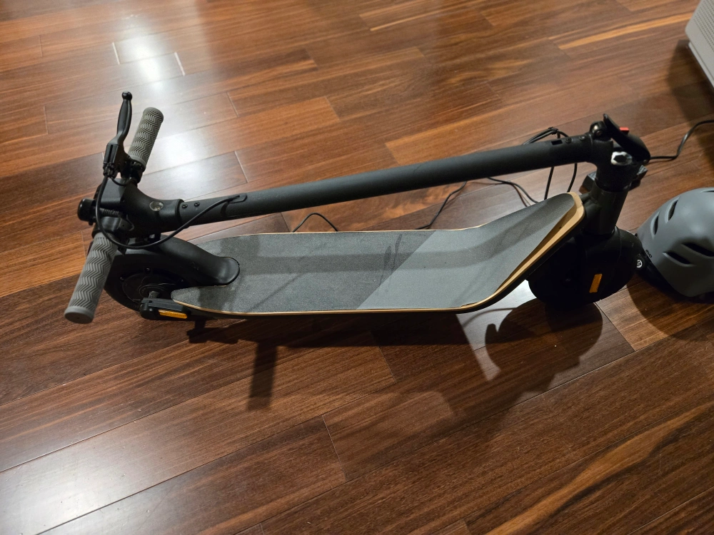 The scooter is black with grey handlebars and a wooden base. It has a digital display and a handbrake. The grey helmet is also included.