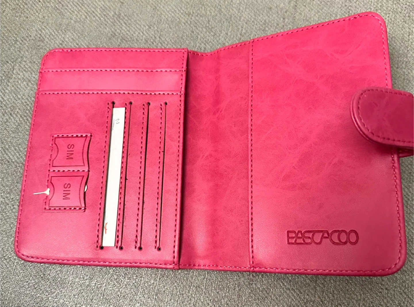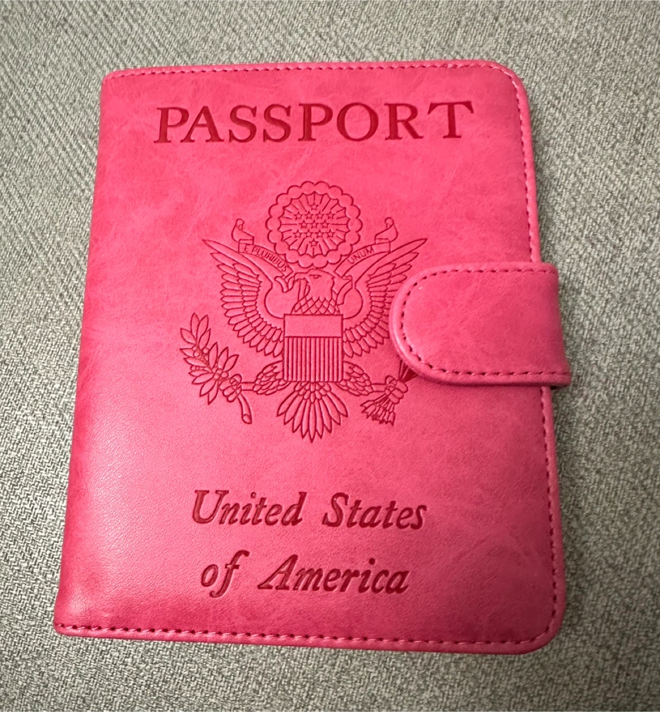 Keep your travel essentials organized with this pink passport holder. It features multiple card slots, a cash slot, and a ticket slot. The magnetic buckle ensures secure closure. It's made from a durable faux leather material.