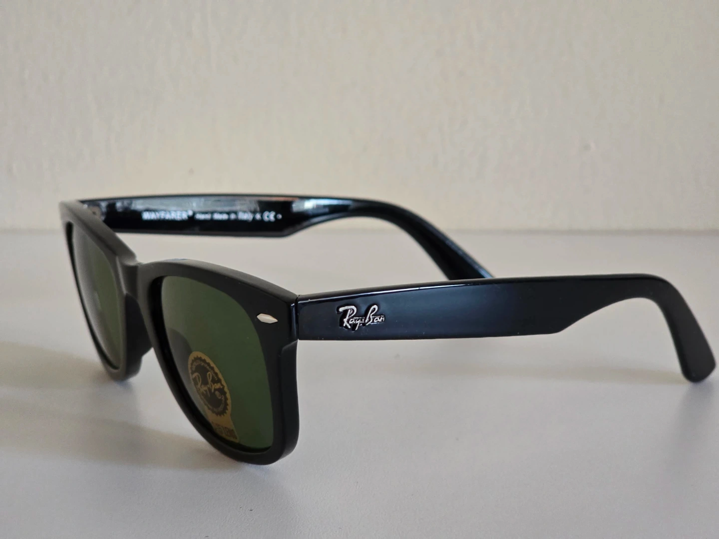 Classic Ray-Ban Wayfarer sunglasses in black with G-15 lenses. Includes original case, box, and cleaning cloth. Made in Italy.