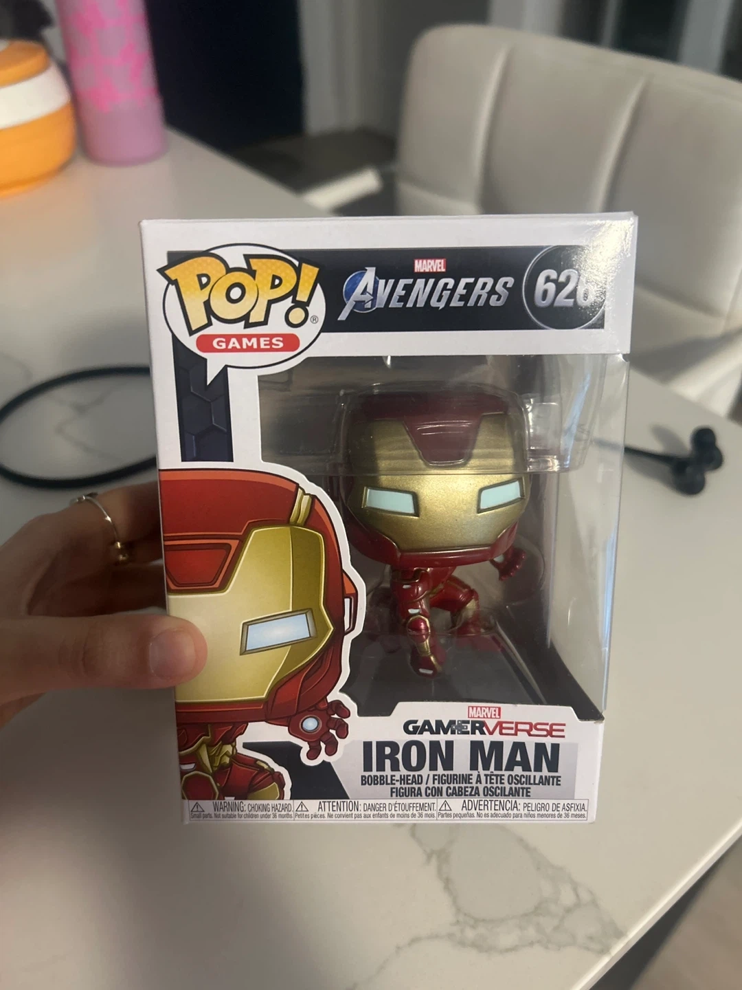 This is a Funko Pop! Games bobble-head figure of Iron Man, model number 626. It's part of the Marvel Gamerverse series. The figure comes in its original packaging.