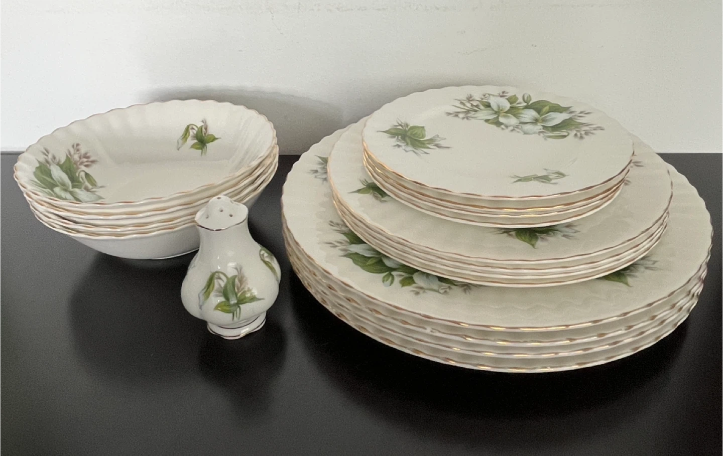 Vintage Royal Albert Bone China dinnerware set in the Trillium pattern. Includes plates, bowls, and a salt shaker.