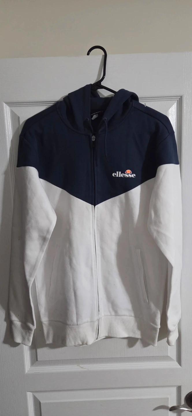 Ellesse full zip hoodie in a stylish navy and white colour block design. Perfect for layering or wearing on its own. Never worn, in perfect condition. Smoke free environment.