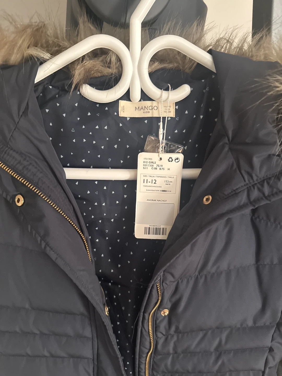 Keep your little one warm in this dark blue puffer coat from Mango Kids. It's designed with a faux fur-trimmed hood and a full zip closure with snap buttons. This coat is a size 11-12 years. It's perfect for chilly weather!