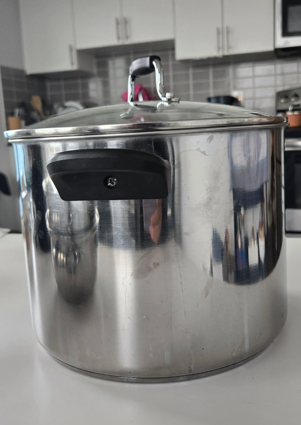 A sturdy stainless steel stock pot with a glass lid. It's suitable for boiling large batches of pasta or making soup. This pot is a great addition to any kitchen for everyday cooking needs.
