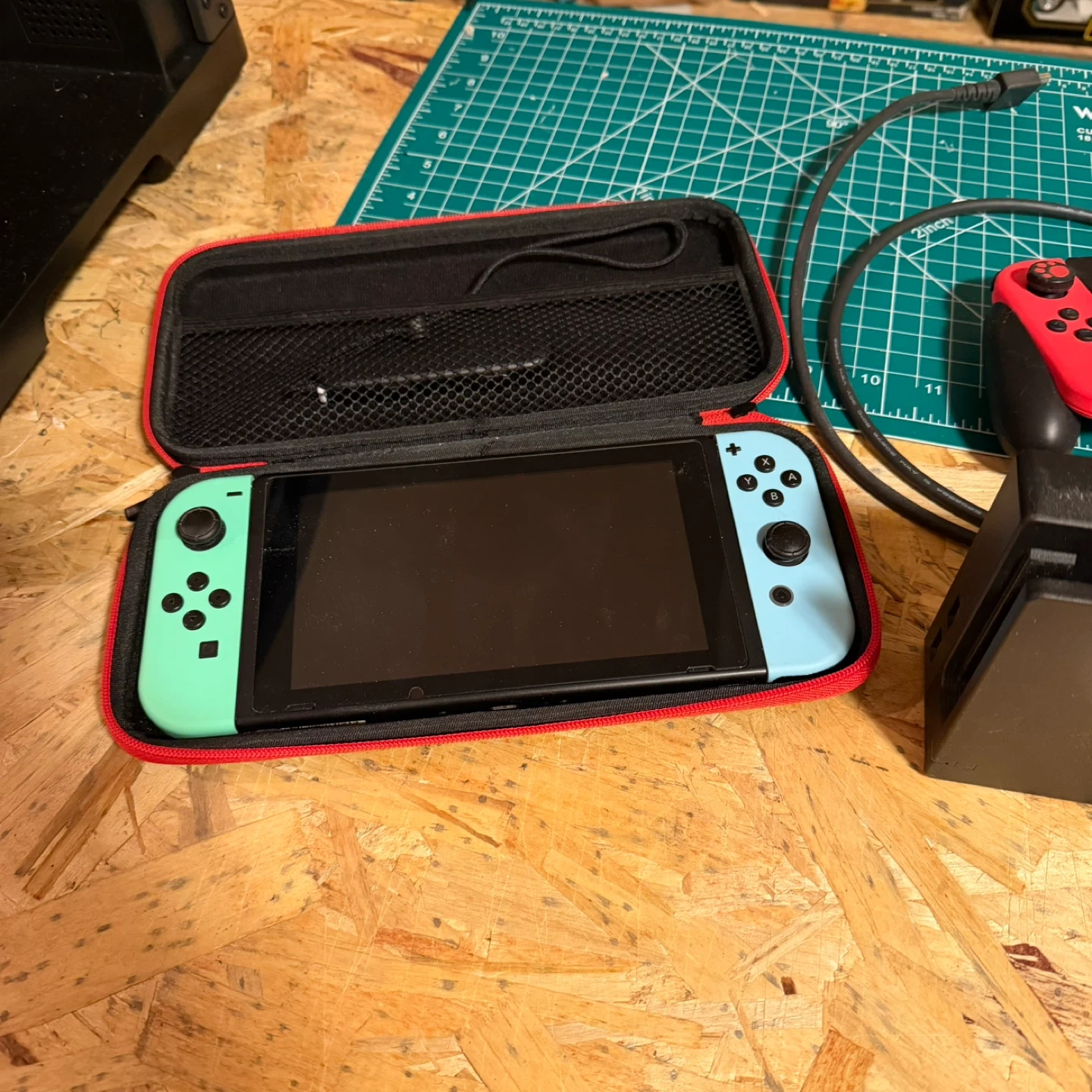Nintendo Switch console with neon red and blue Joy-Cons. It's a great portable gaming system that also docks for TV play. Includes the dock, AC adapter, and a protective travel case. Play your favourite games on the go or at home!