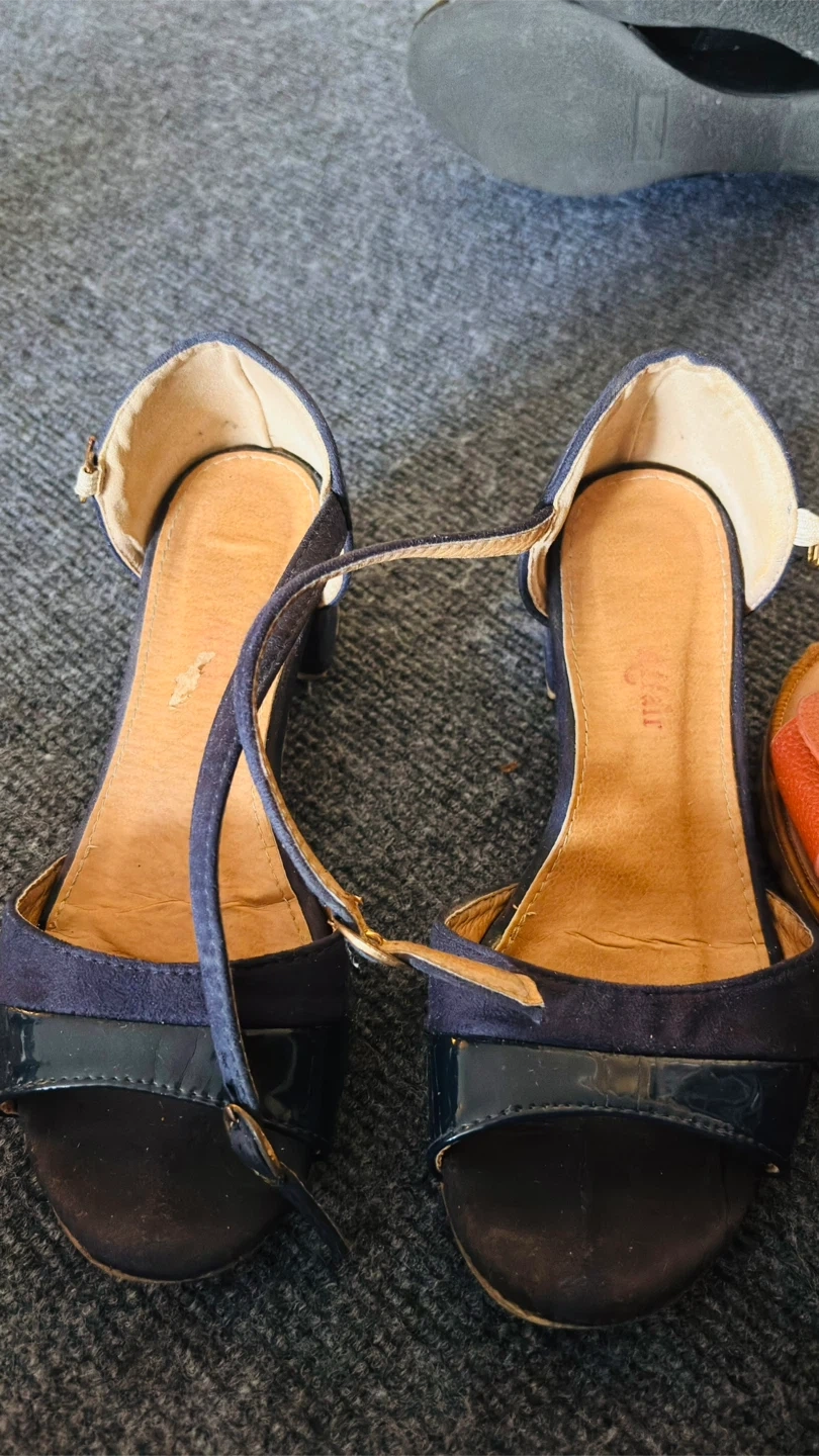 These black block heel sandals feature a navy blue suede upper with a patent toe strap. They have an adjustable ankle strap for a secure fit. Size is 36.
