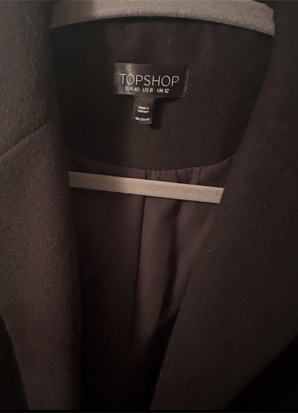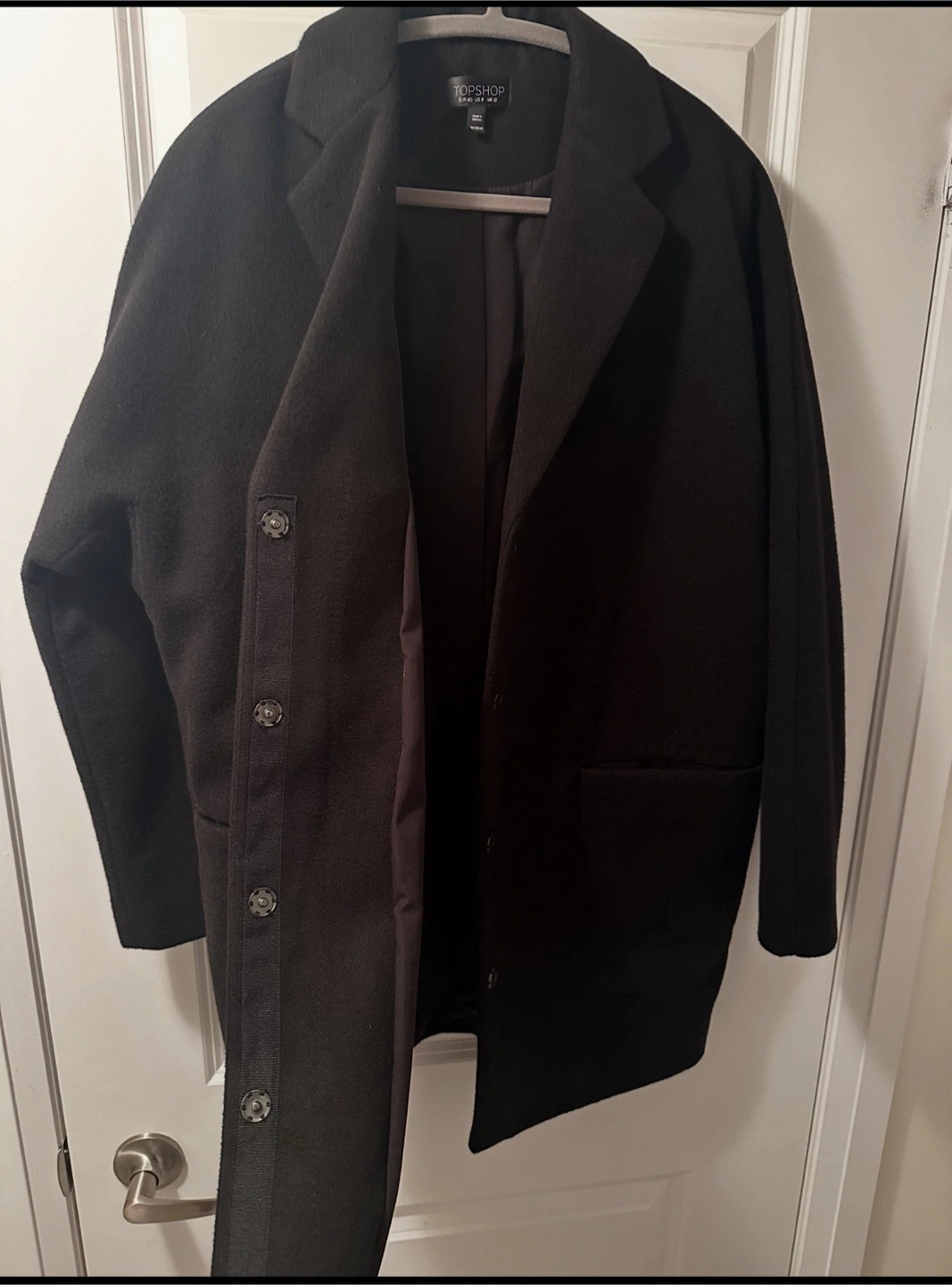 Selling a Topshop black coat, size US 8. It's in great condition and ready for a new owner! This stylish coat is perfect for layering during the cooler months. It's a versatile piece that can be dressed up or down.
