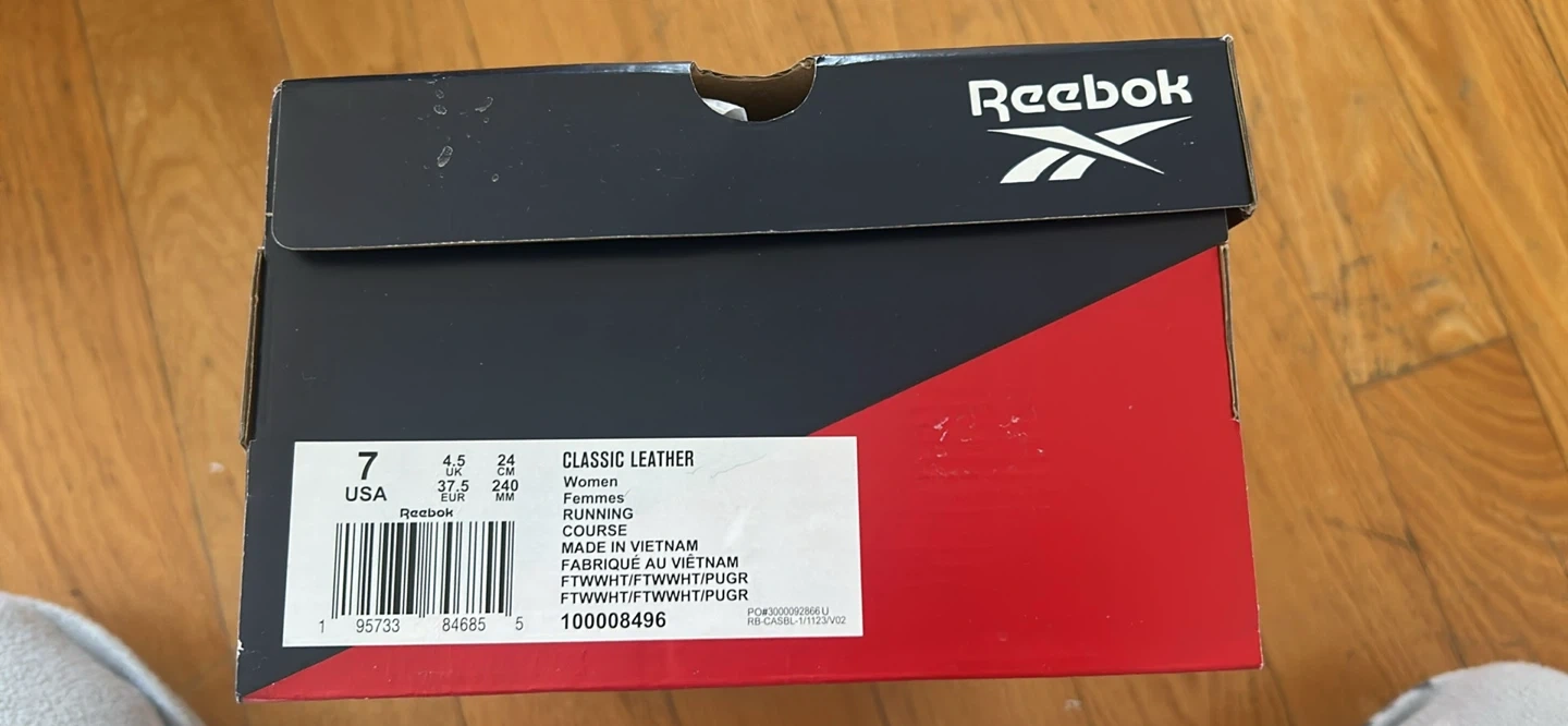 These are white Reebok Classic Leather running shoes for women. They're a size 7 USA and made of leather. Includes original box and tags.
