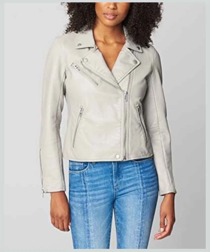 Stylish BLANKNYC faux leather moto jacket in gray, size S. Features a cool asymmetrical zipper and zippered pockets, with snap buttons on the collar.