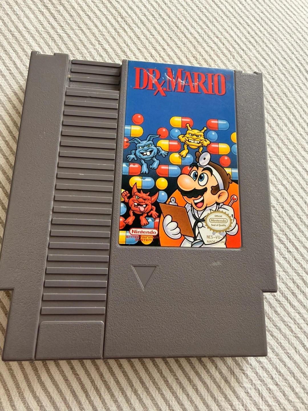 This is the Dr. Mario video game cartridge for the Nintendo Entertainment System. It's a classic puzzle game from 1990. The cartridge is gray and made of plastic.