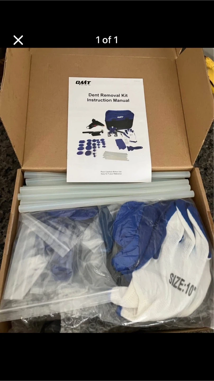 This is an OMT dent removal kit. It includes a glue gun, tabs, a pulling bridge, and a carrying bag. Gloves in size 10" are also included. Instructions are also in the box.