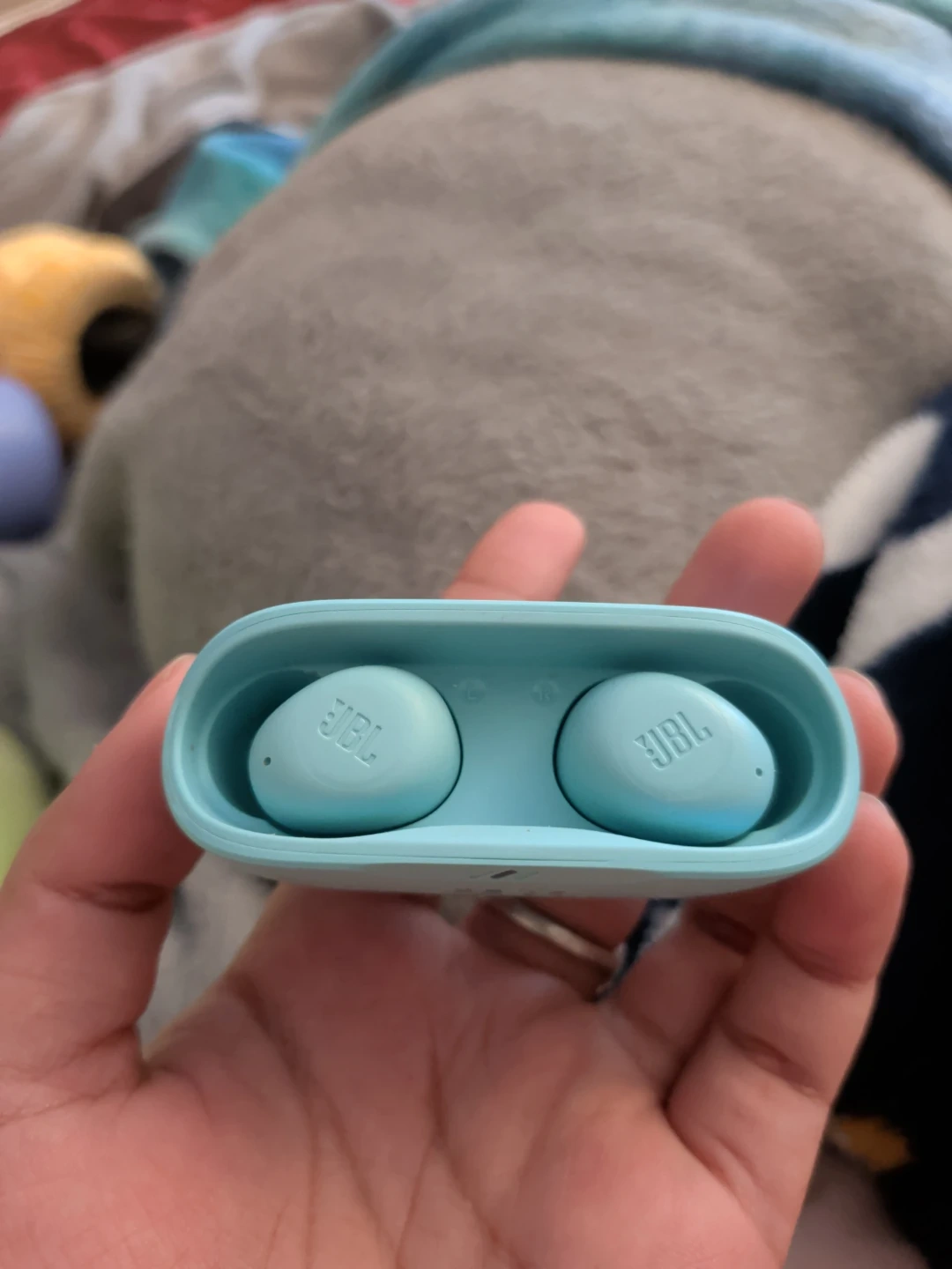 Mint JBL wireless earbuds with charging case. Provides clear sound and a comfortable fit. Includes earbuds and case.