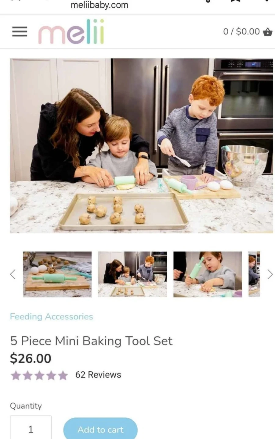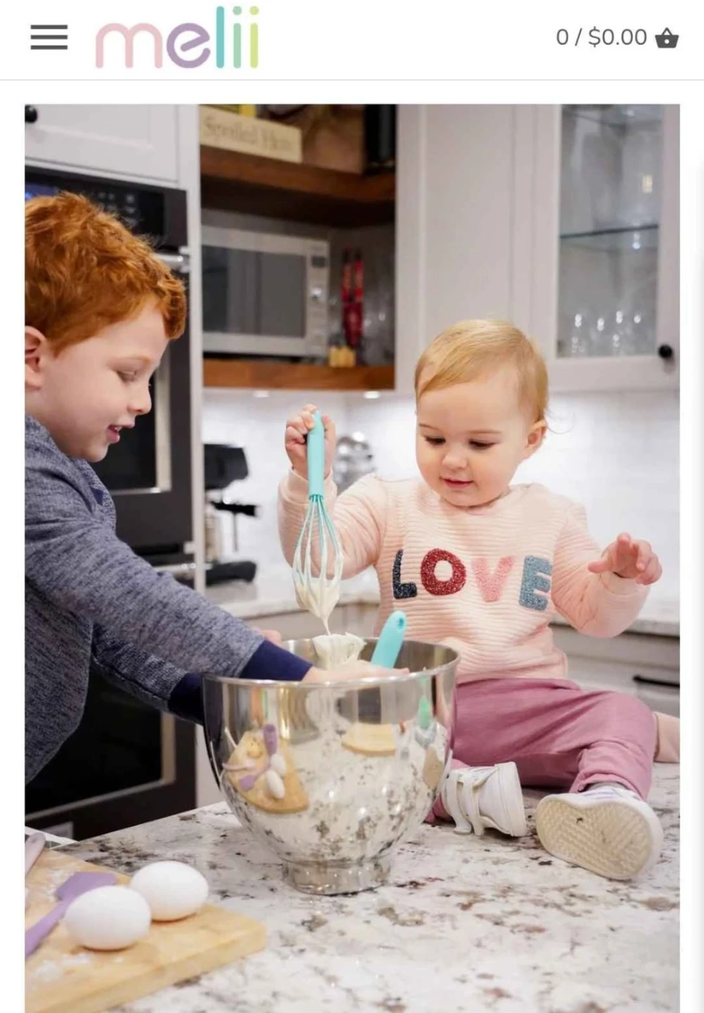 This is a 5-piece mini baking tool set from Meli. It's designed for little chefs to help in the kitchen. The set includes a whisk, spatula, and other mini tools for baking fun!