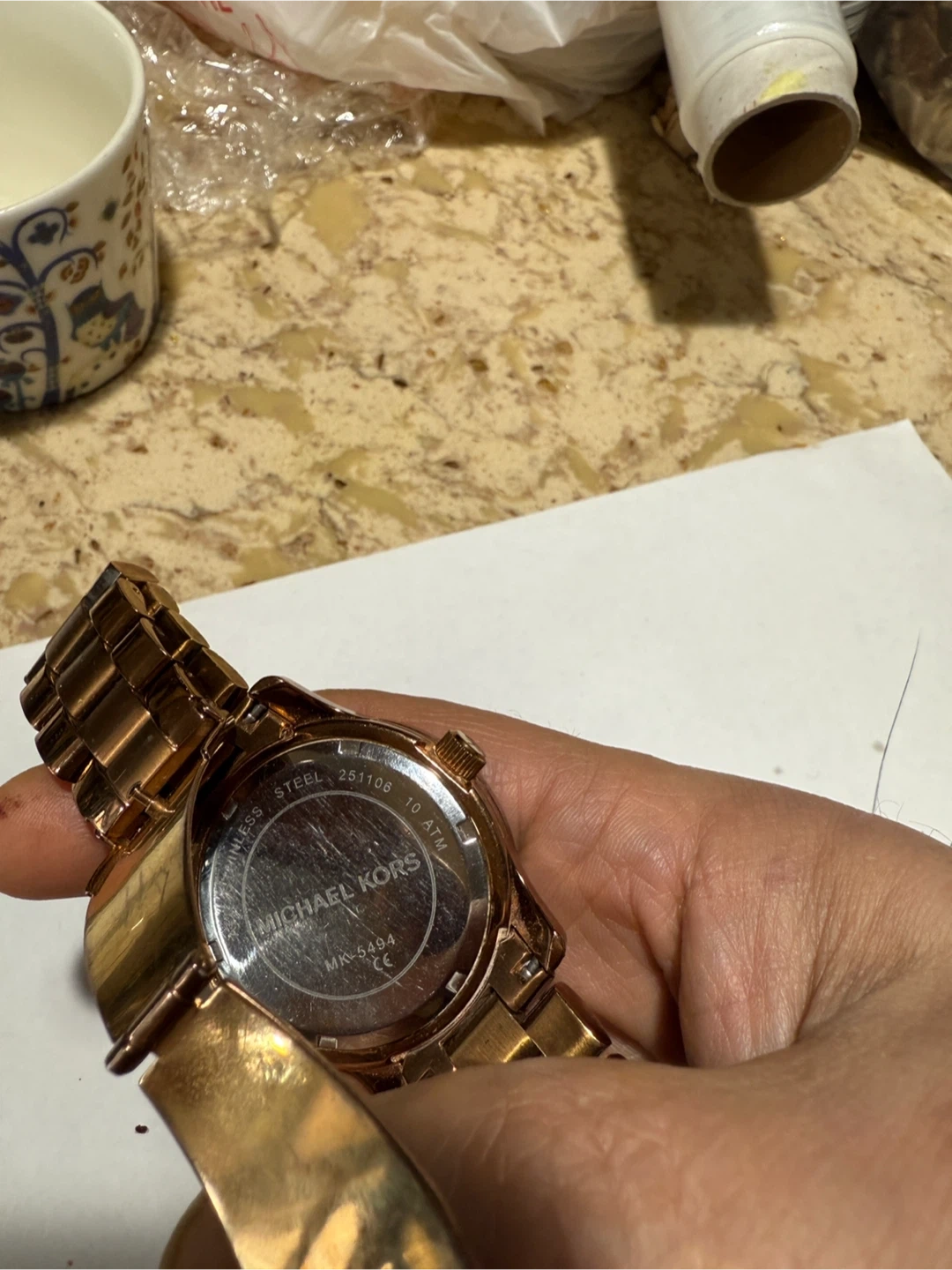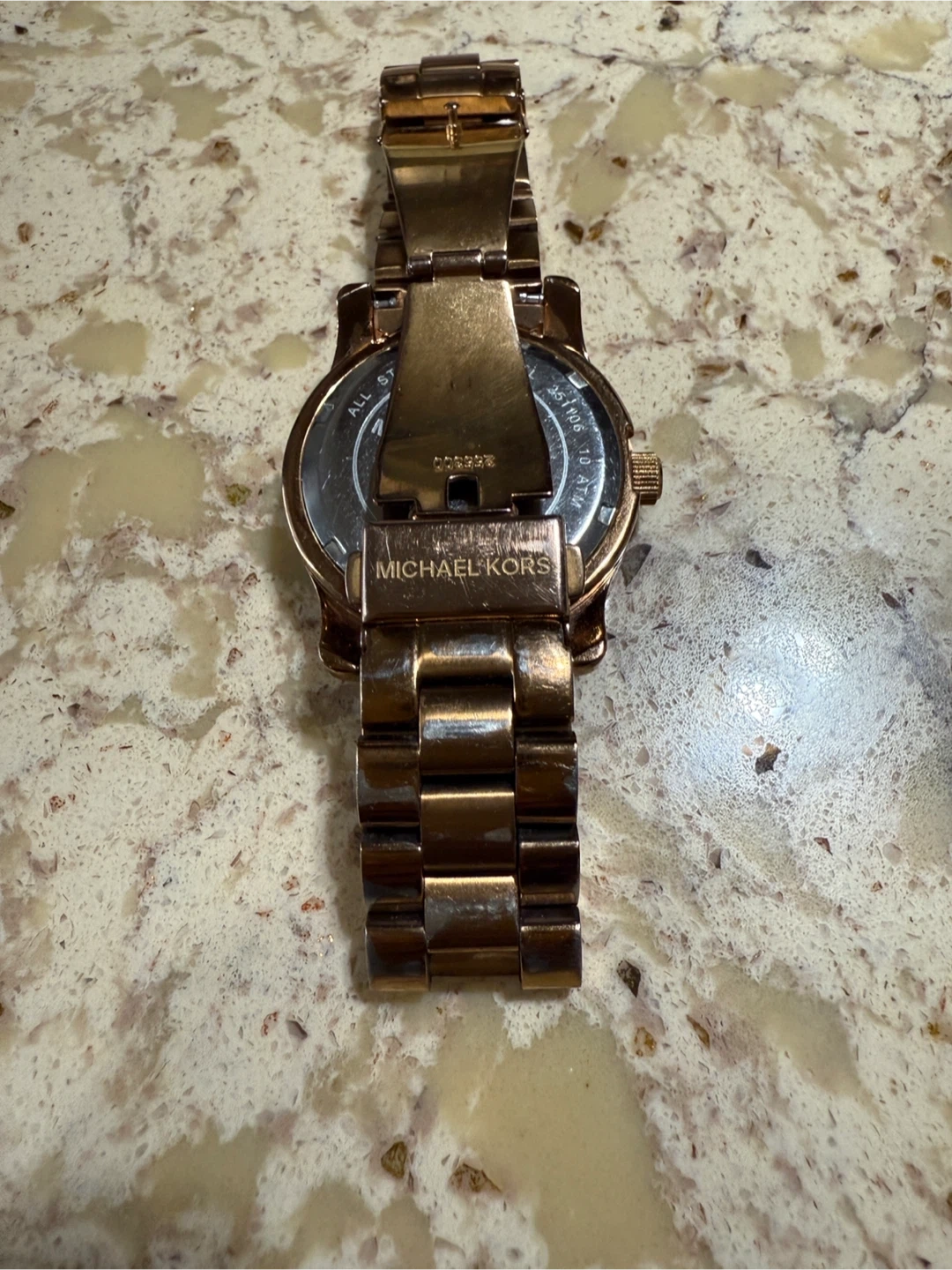 This Michael Kors watch features a rose gold tone and a crystal-embellished bezel. It's made of stainless steel and is water-resistant up to 10 ATM. The watch has a date function visible on the dial.