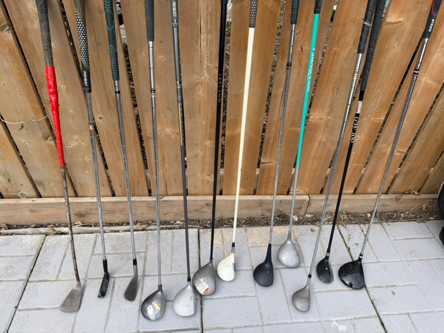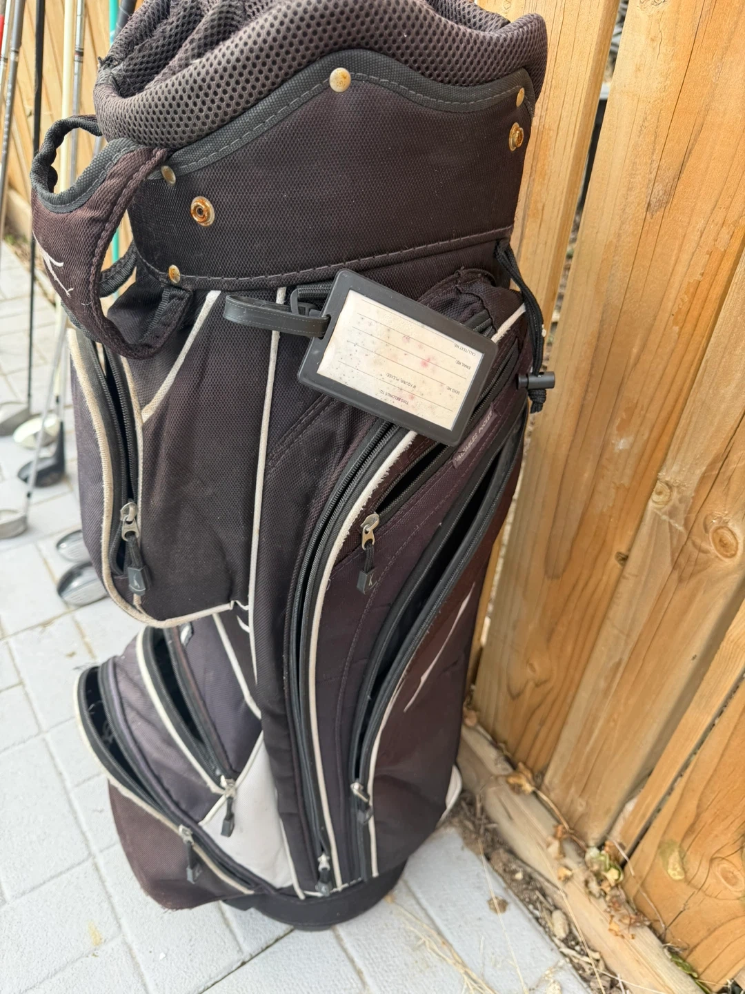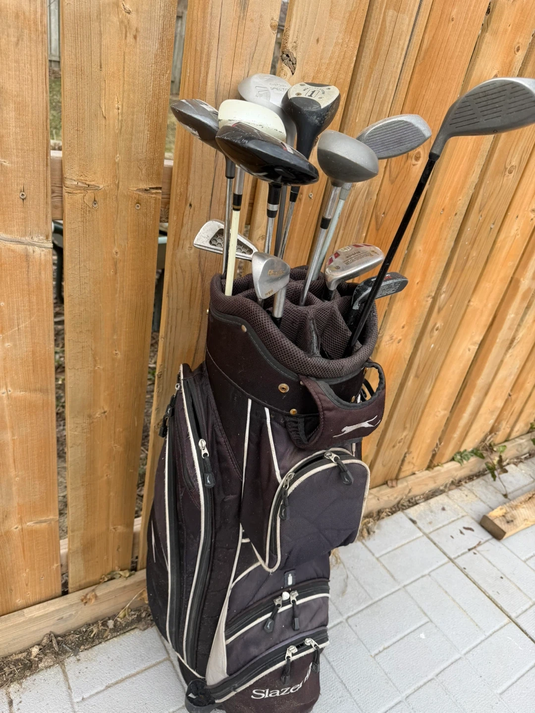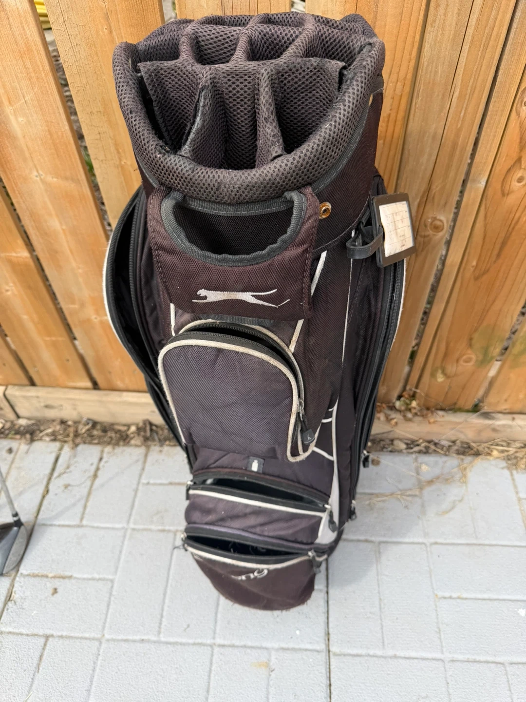 This is a Slazenger golf bag with 11 golf clubs. Includes a variety of clubs with different shaft types and club heads. The bag is black with white trim and features multiple compartments for storage. It's suitable for both beginners and intermediate golfers looking to upgrade their set.
