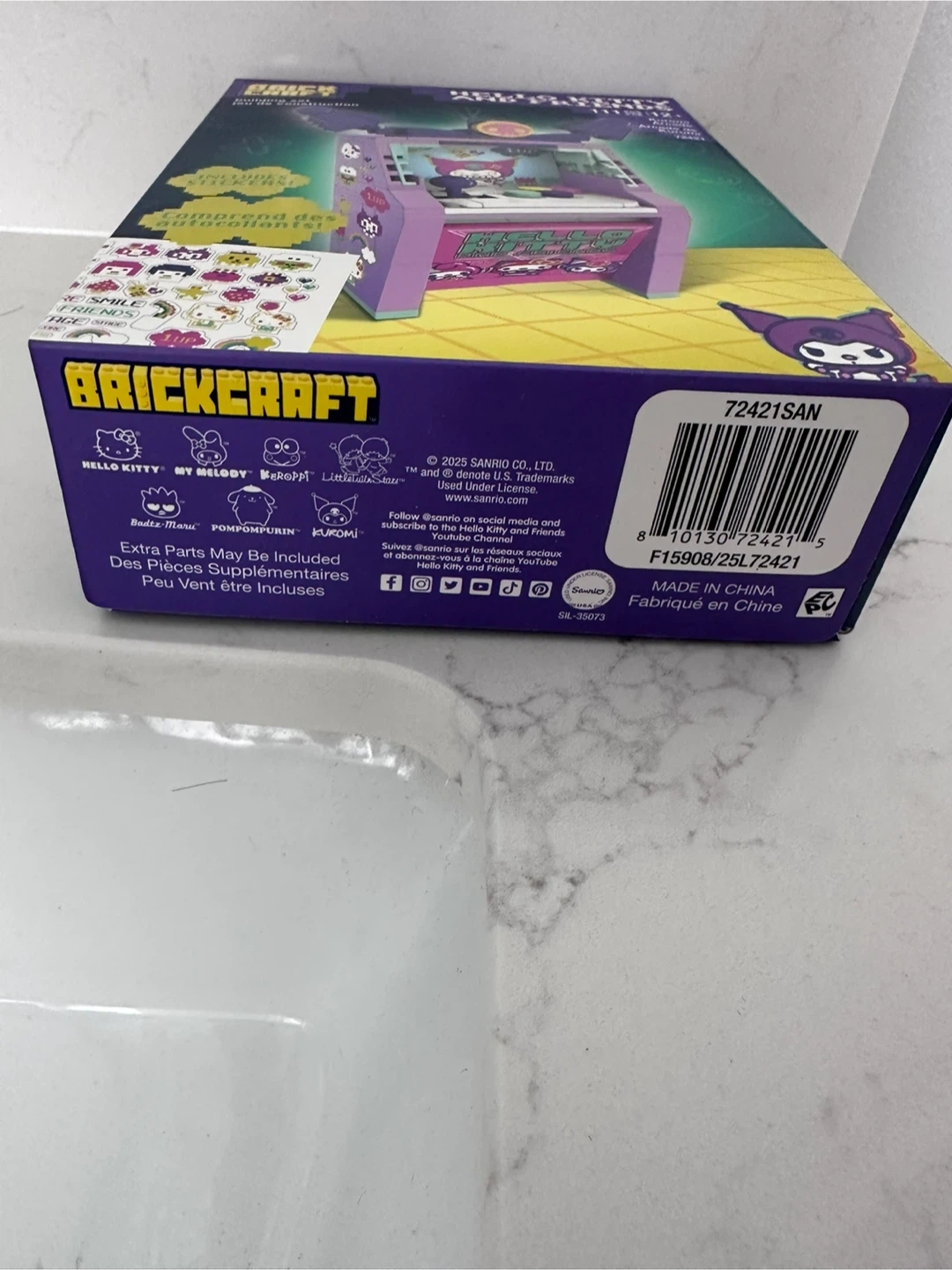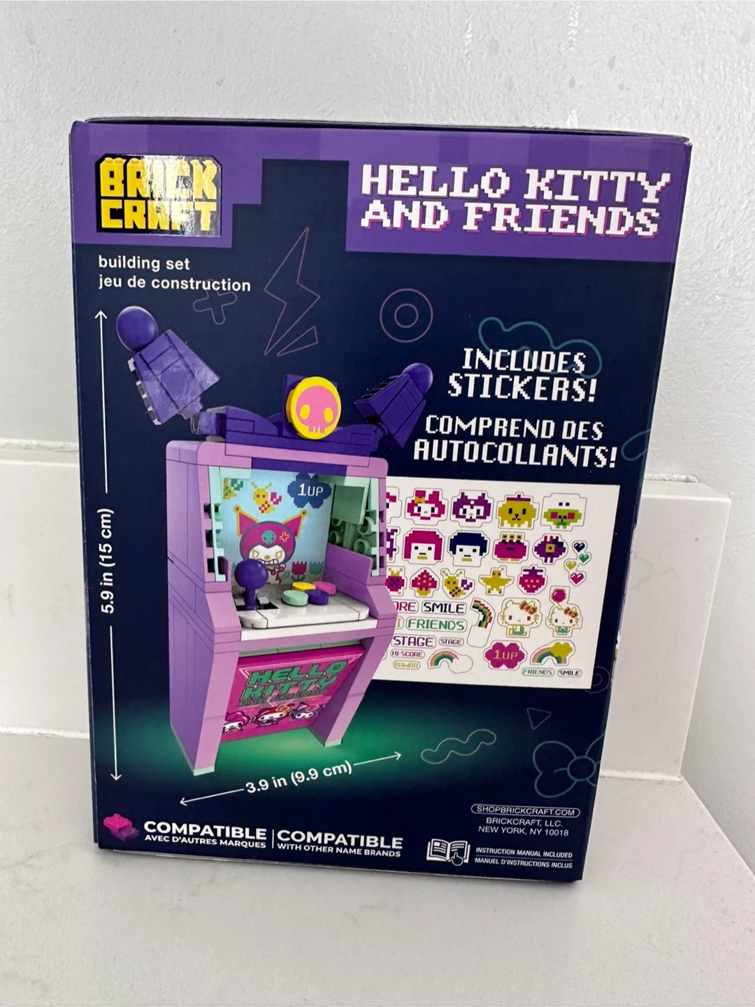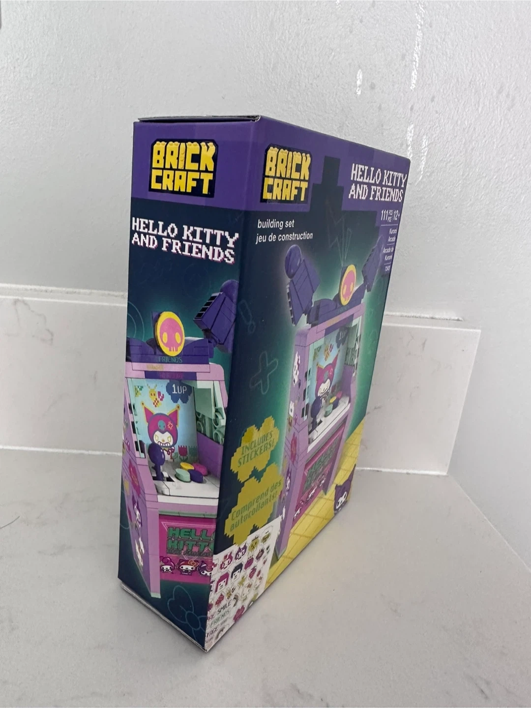 Brand new Brickcraft building set features a Kuromi Arcade from the Hello Kitty and Friends collection. It includes 111 pieces and comes with stickers. Dimensions are 5.9 inches (15 cm) tall by 3.9 inches (9.9 cm) wide.