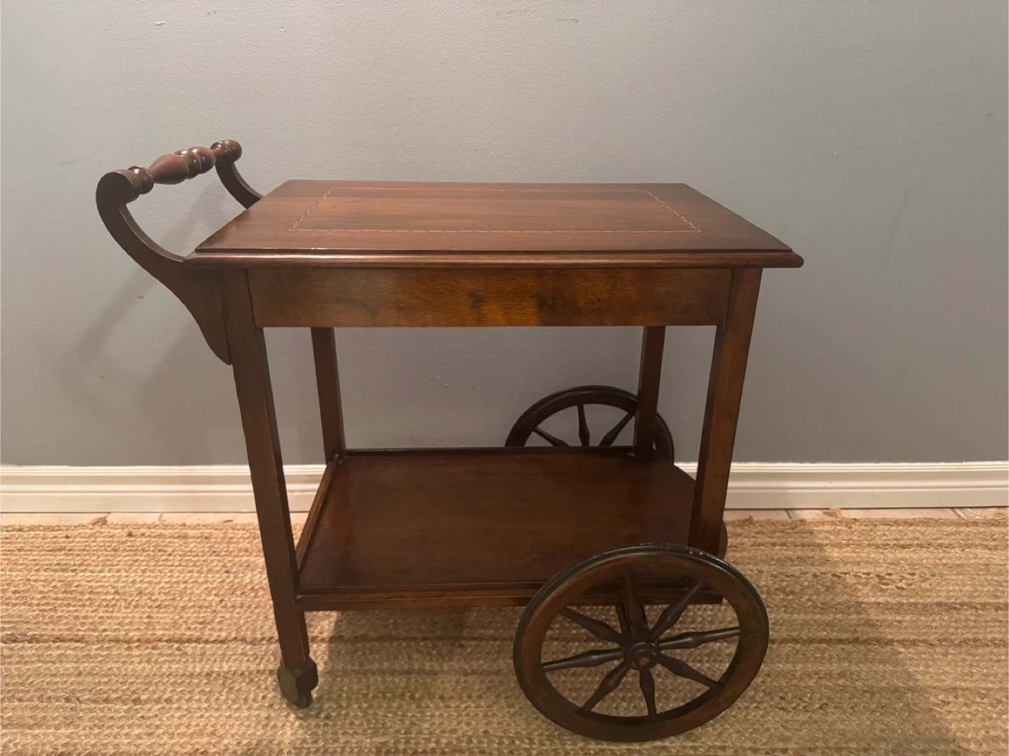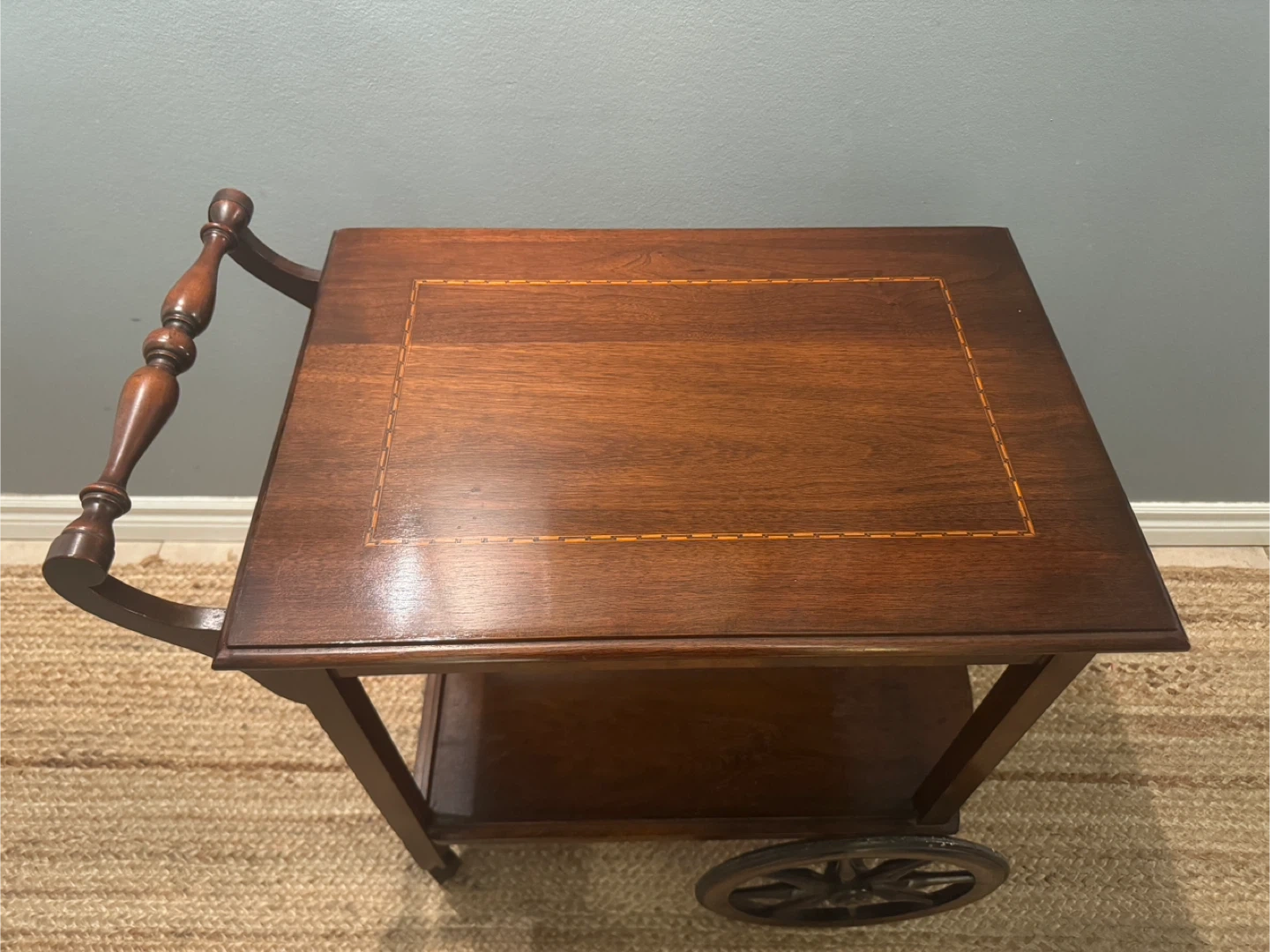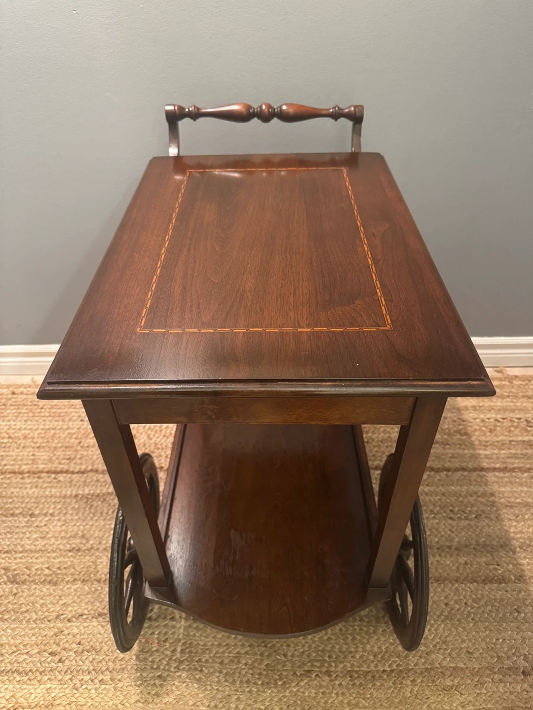 This beautiful wooden serving cart features two tiers and decorative inlay on the top surface. It has large spoked wheels on the back and smaller casters on the front for easy manoeuvrability. The carved wooden handle makes pushing and steering a breeze. It's a stylish way to serve drinks or snacks!