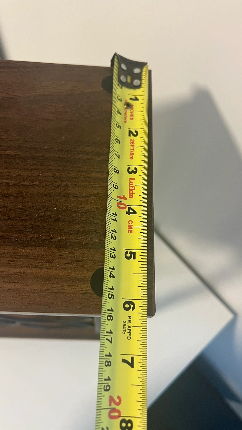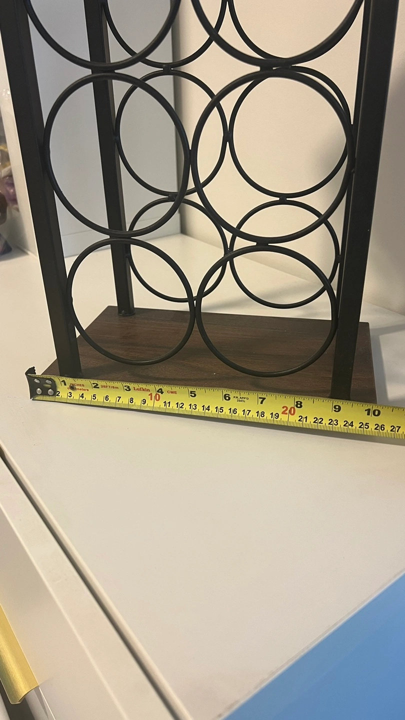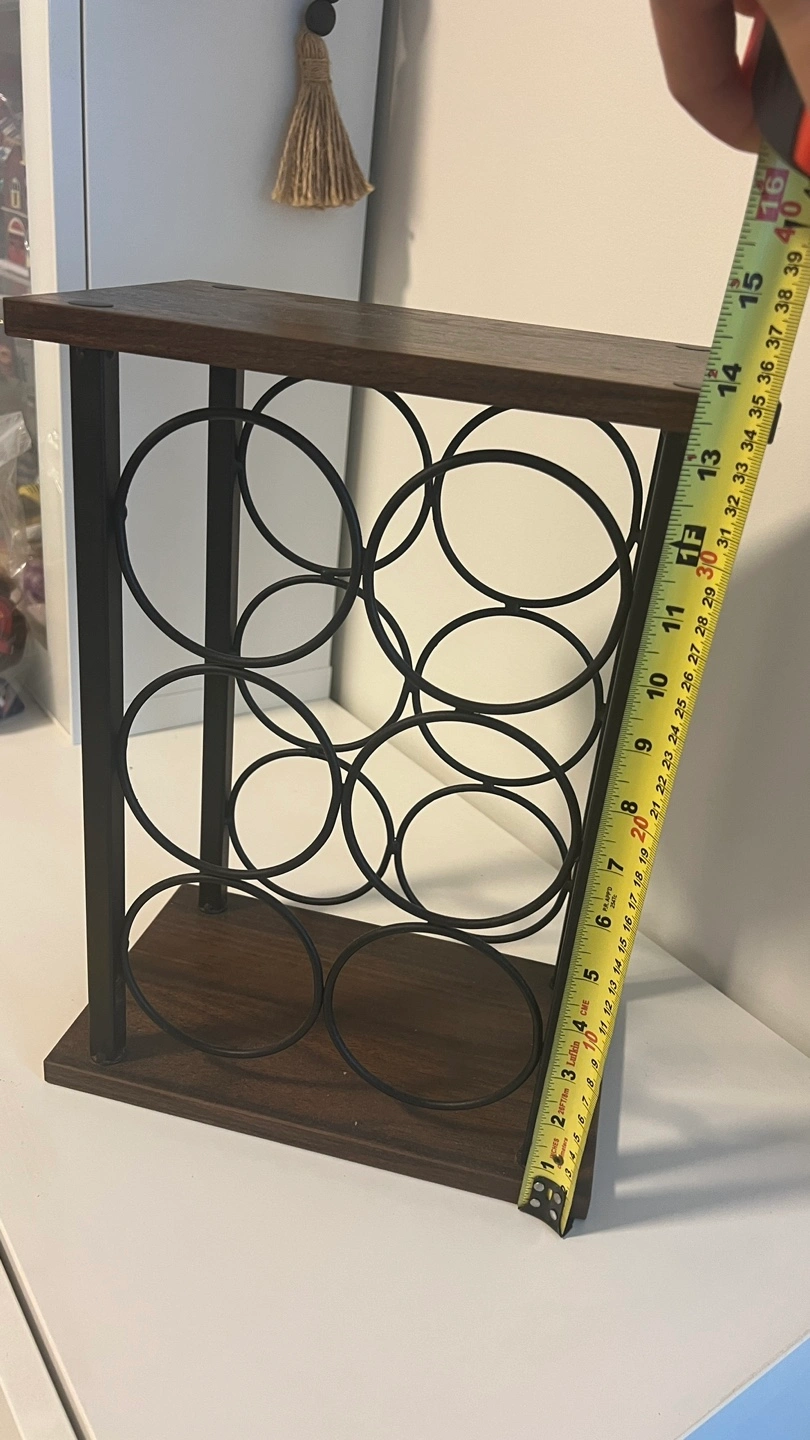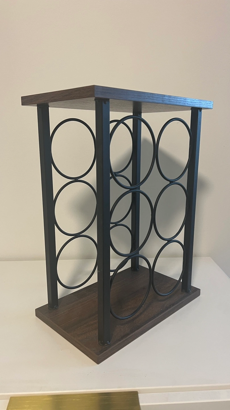 Stylish wine rack. Dark brown wood and black metal. Holds eight bottles of wine. Compact design, perfect for small spaces. Approximately 14 inches tall and 10 inches wide.