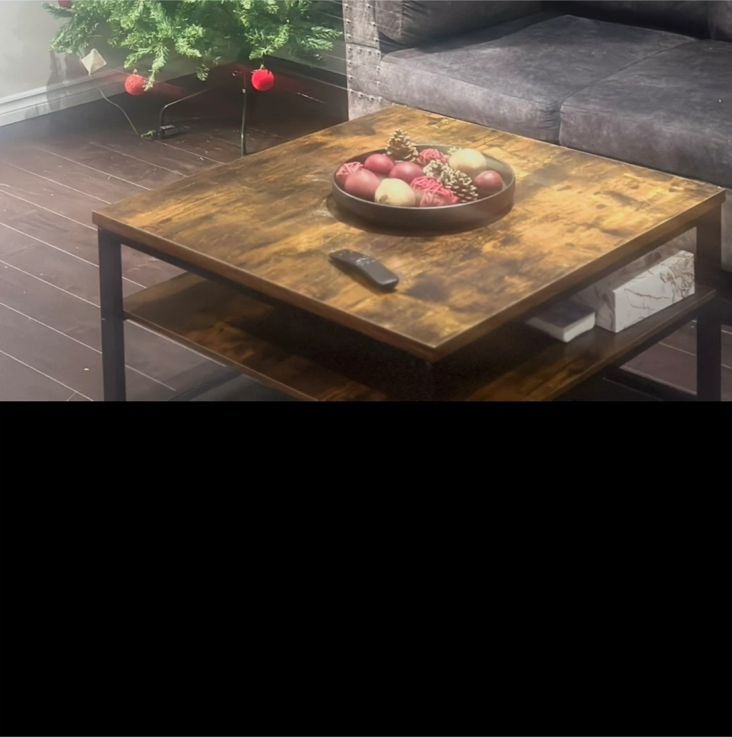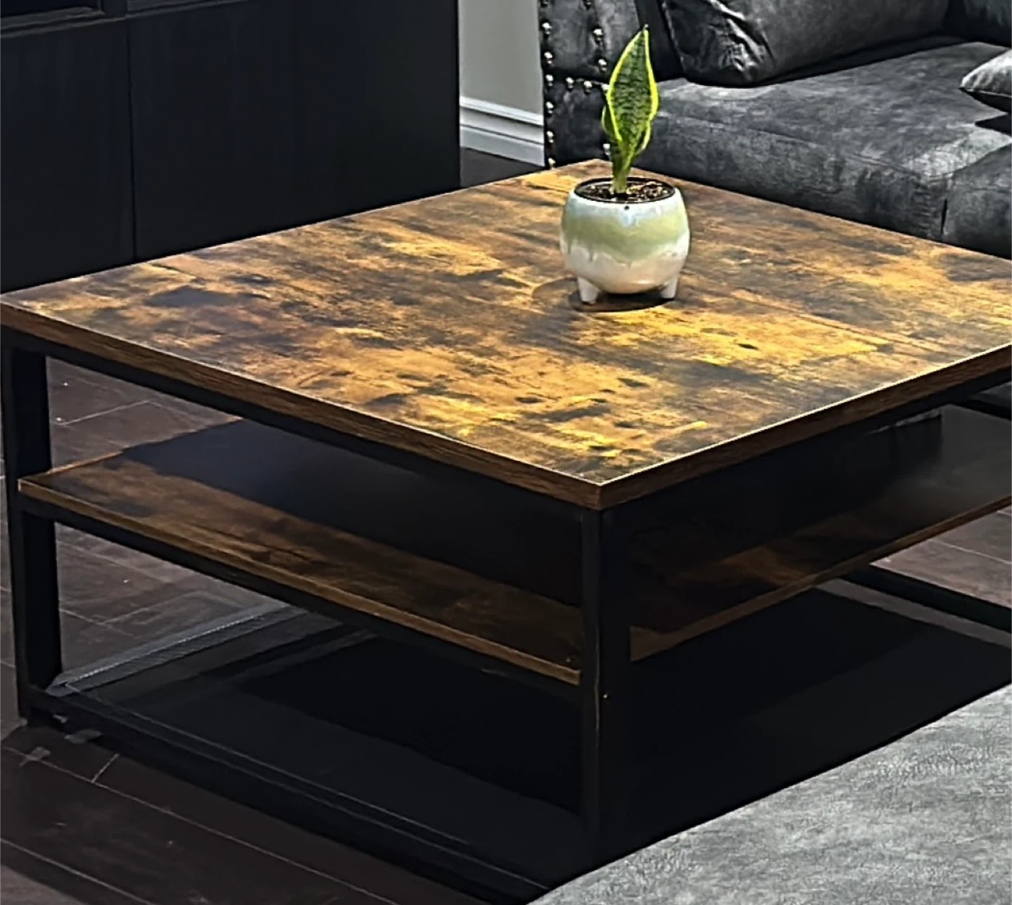 Square coffee table with a rustic wood-look top and black metal frame. It features two shelves for extra storage space. This table is a great addition to any living room!