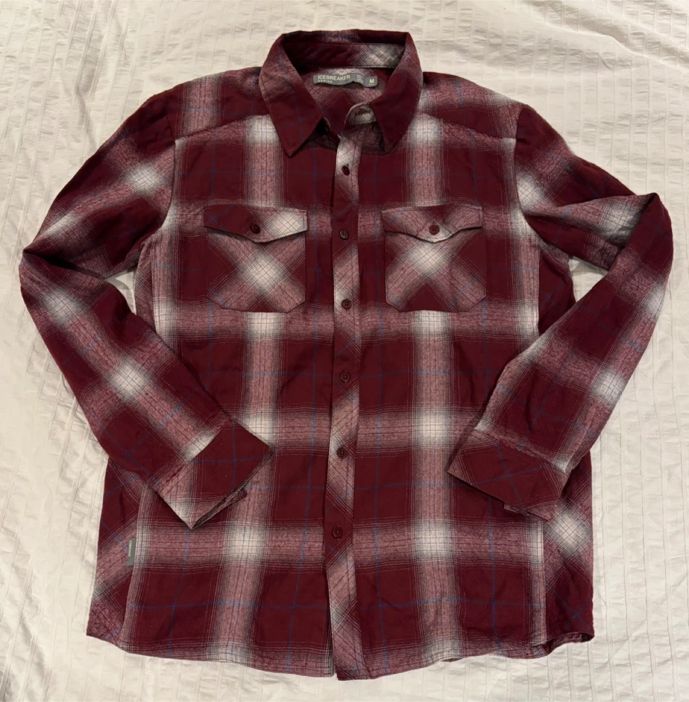 Icebreaker merino wool flannel shirt for men. It's a size medium in a classic plaid pattern. This shirt is great for layering during cooler weather.
