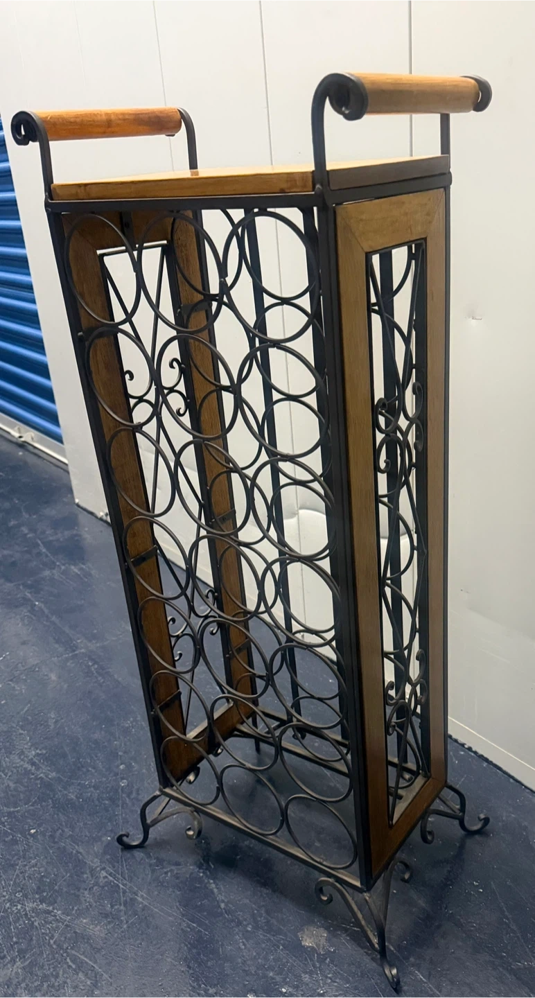 This tall wine rack holds up to 20 bottles. It's made of black metal with wood accents and a wooden top. The decorative metalwork adds a nice touch.