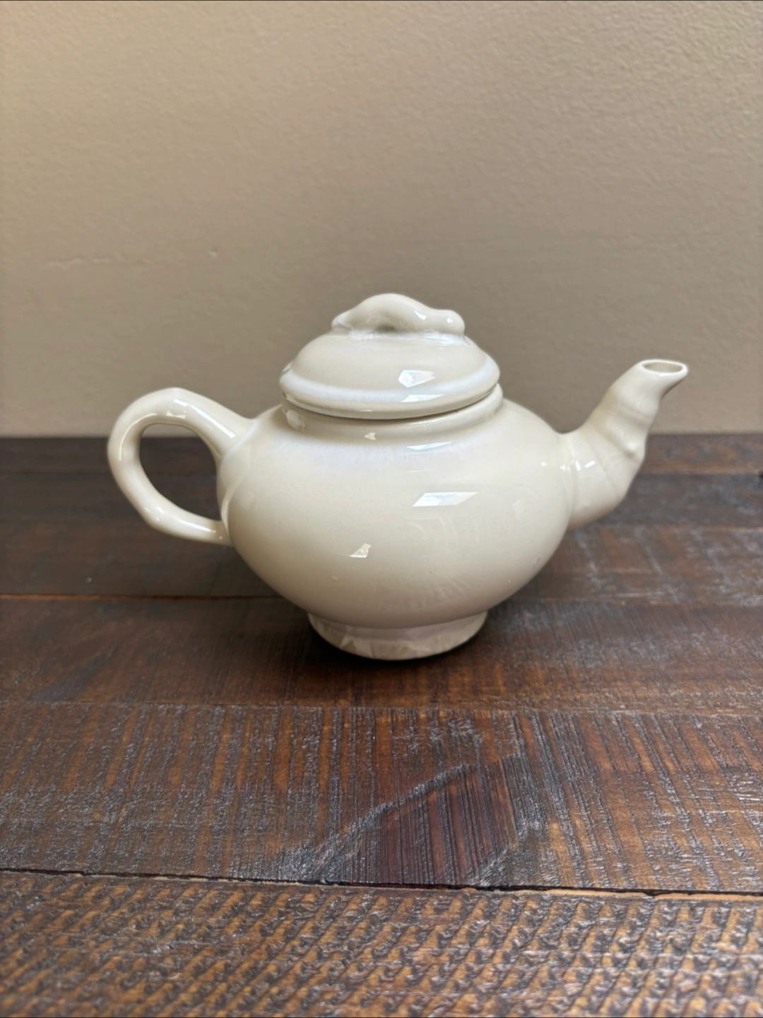 Here's a cute little teapot for sale! It's cream coloured and made of ceramic. It measures approximately 7 inches in length and 6 inches in height.