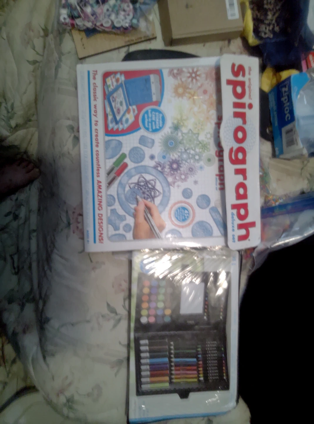 This Spirograph Deluxe Art Set lets you create countless amazing designs. It includes all the gears, pens, and paper you need to get started. It's a classic way to make intricate patterns! Tote full of misc craft supplies