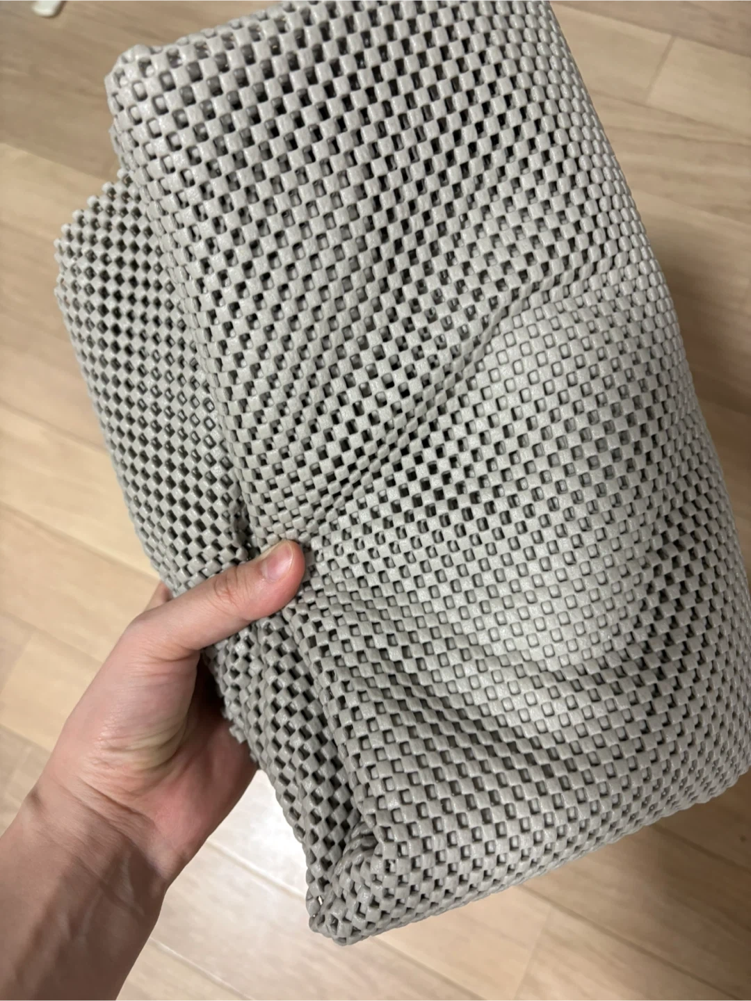 Grey non-slip rug pad. This pad provides grip to keep rugs in place. Made of durable material. Great for use under carpets on hard floors!