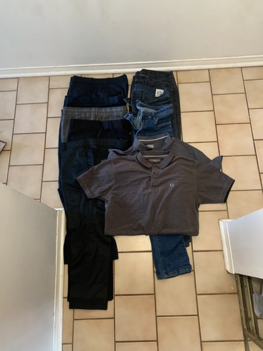 Bundle of men's clothing featuring a charcoal grey Fred Perry polo shirt and several pairs of pants. Includes a mix of dress pants and jeans. All items are for men.
